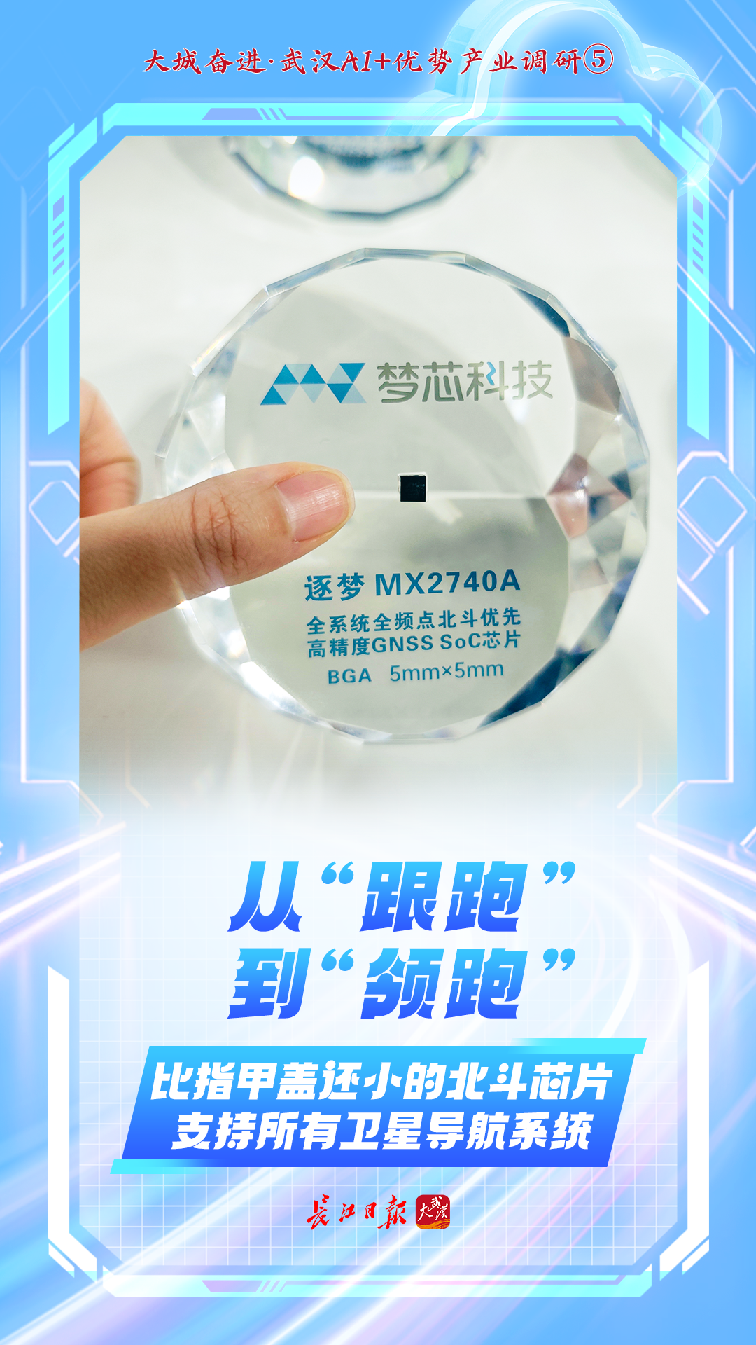 “这是我们自主研发的新一代AI融合定位芯片,相比同类产品尺寸降低50%,功耗降低40%,而信号捕获速度提升20倍。”梦芯科技董事长韩绍伟手持样品介绍说,这款逐梦系列芯片在强电磁干扰下仍保持厘米级定位,可广泛应用在无人机、智能驾驶等领域。