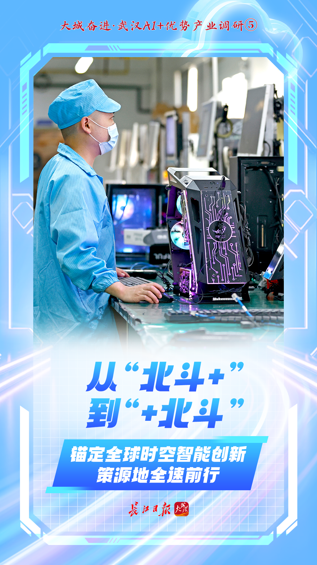 清晨,江汉关钟楼的北斗原子钟嘀嗒跳动;白天,武汉街头无人驾驶出租车自如穿梭;入夜,长江江面无人机穿透夜幕监控航道……这些场景,是武汉“人工智能+北斗”产业生态链的缩影。
