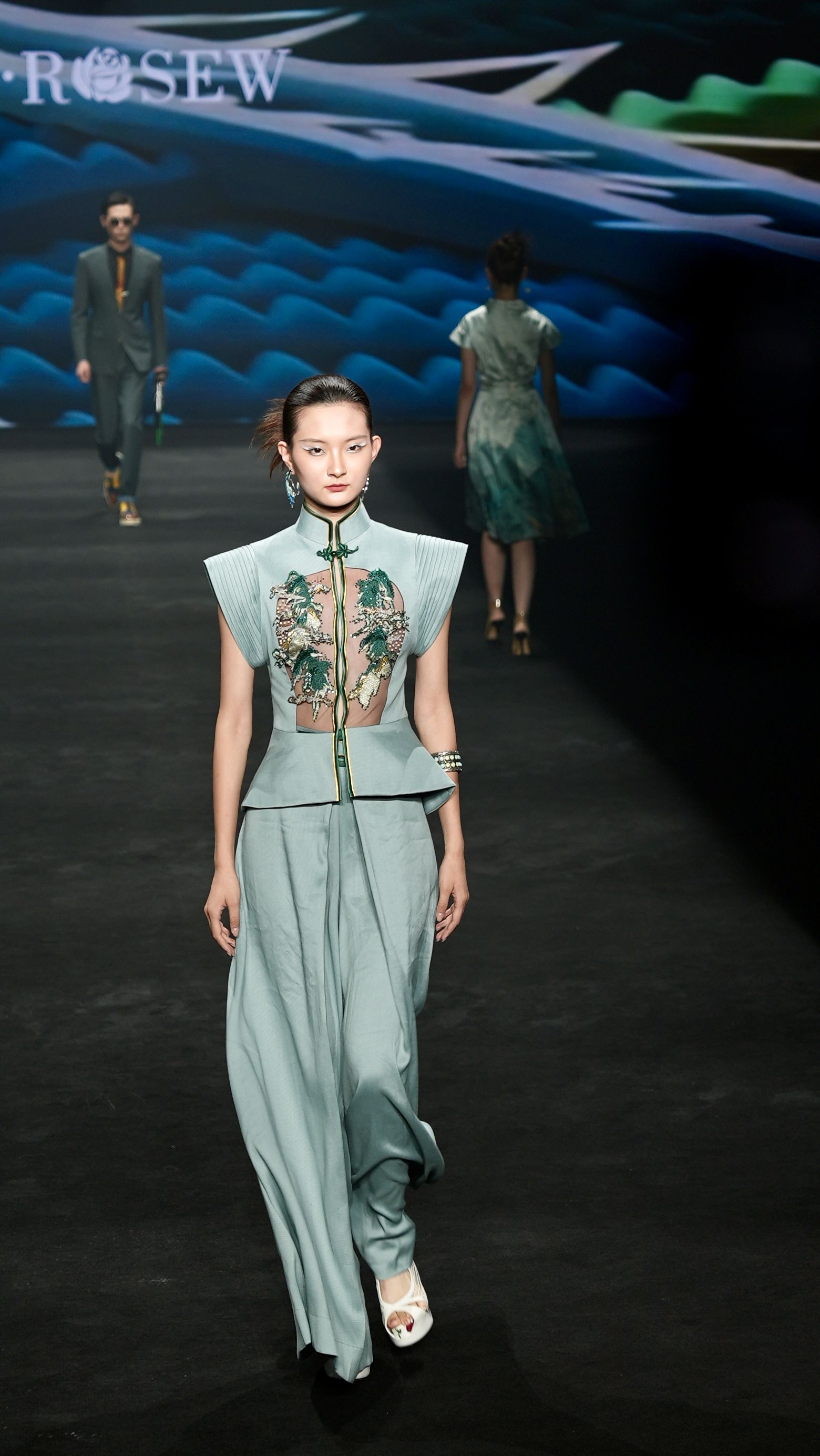 开幕大秀上,新汉派服装设计大赛作品展示聚焦全国各地及汉正街本土年轻设计力量,青年设计师围绕“新生·绿意”主题,以黄鹤楼、东湖、大桥等武汉元素和地域文化为灵感,呈现了兼具创新性与商业价值的作品。