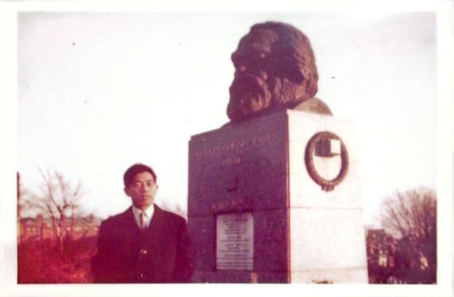 1965年李子彬留学英国时在马克思墓前的照片。受访者供图