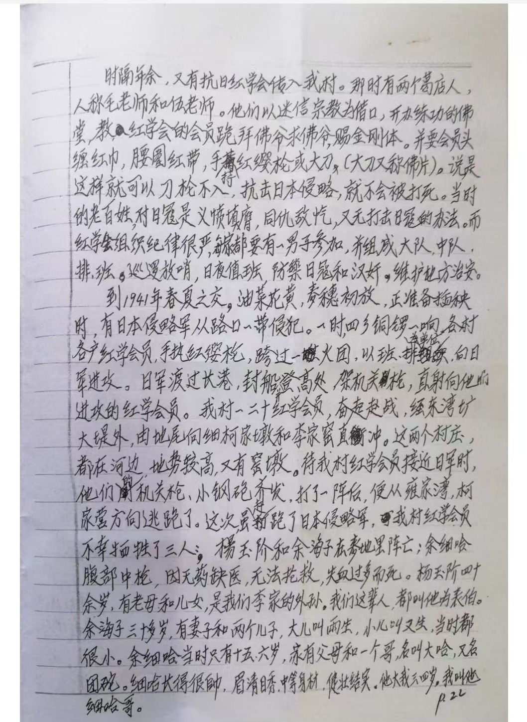 “抗日战争那段经历,父亲一生都没有忘记,他生前多次讲给儿孙听,提醒我们不忘历史。”李明告诉记者,父亲回忆录中提到的5位英雄村民,都是普普通通的老百姓,其中余海子的大儿子余雨生(后改名余安能)参加了抗美援朝,2021年在宜昌逝世;小儿子余又生一直在故土生活,前些年去世。余又生的儿子余庆华与李明年纪相仿。魏时福之子魏太木前几年去世,其孙魏楚平、魏加平、魏细平在李家墩生活。