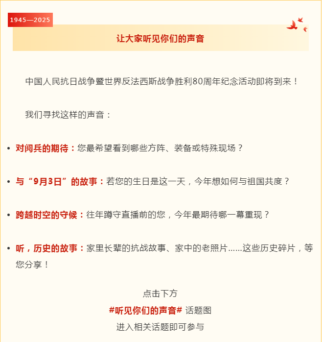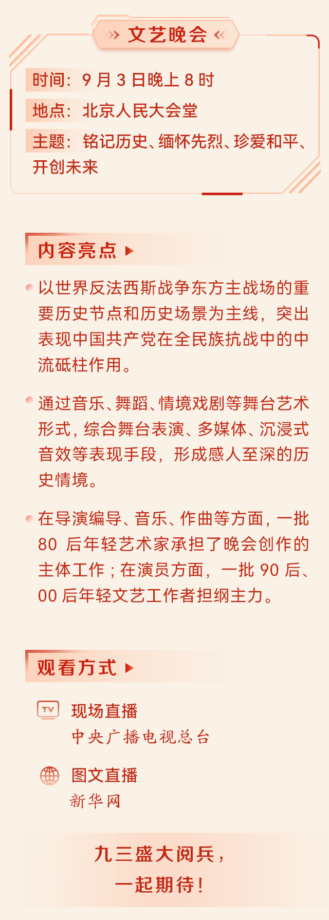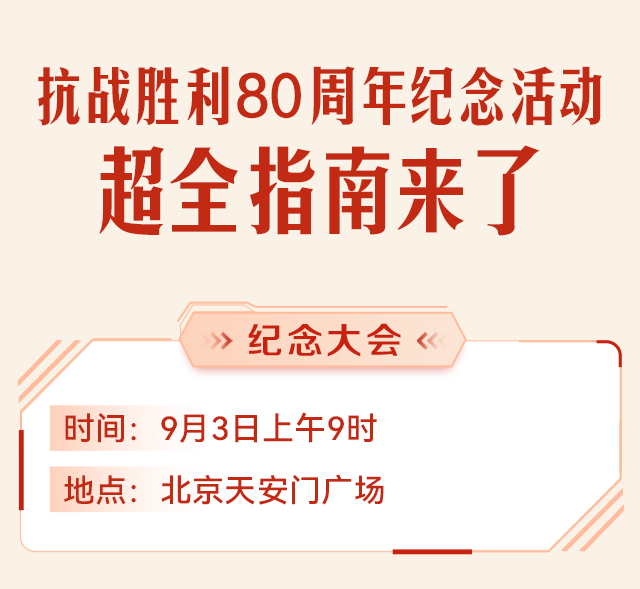 就在明天!具体安排来了 ©原创 2025-09-02 07:21 0 倒计时1天! 天安门广场和长安街盛装以待 纪念中国人民抗日战争 暨世界反法西斯战争胜利80周年大会 将于明天(9月3日)举行 明天有哪些看点? 如何观看? 这份超全指南 带您无缝参与全程 不错过每一个震撼瞬间 致敬伟大胜利,共襄民族荣光 ▼ 让千万武汉市民听到你的声音 赶快参与吧! 策划:张凡 张颖 文案/制作:曹欣怡 设计:张莉 部分来源:新华社、央视新闻客户端 【编辑:丁翾】