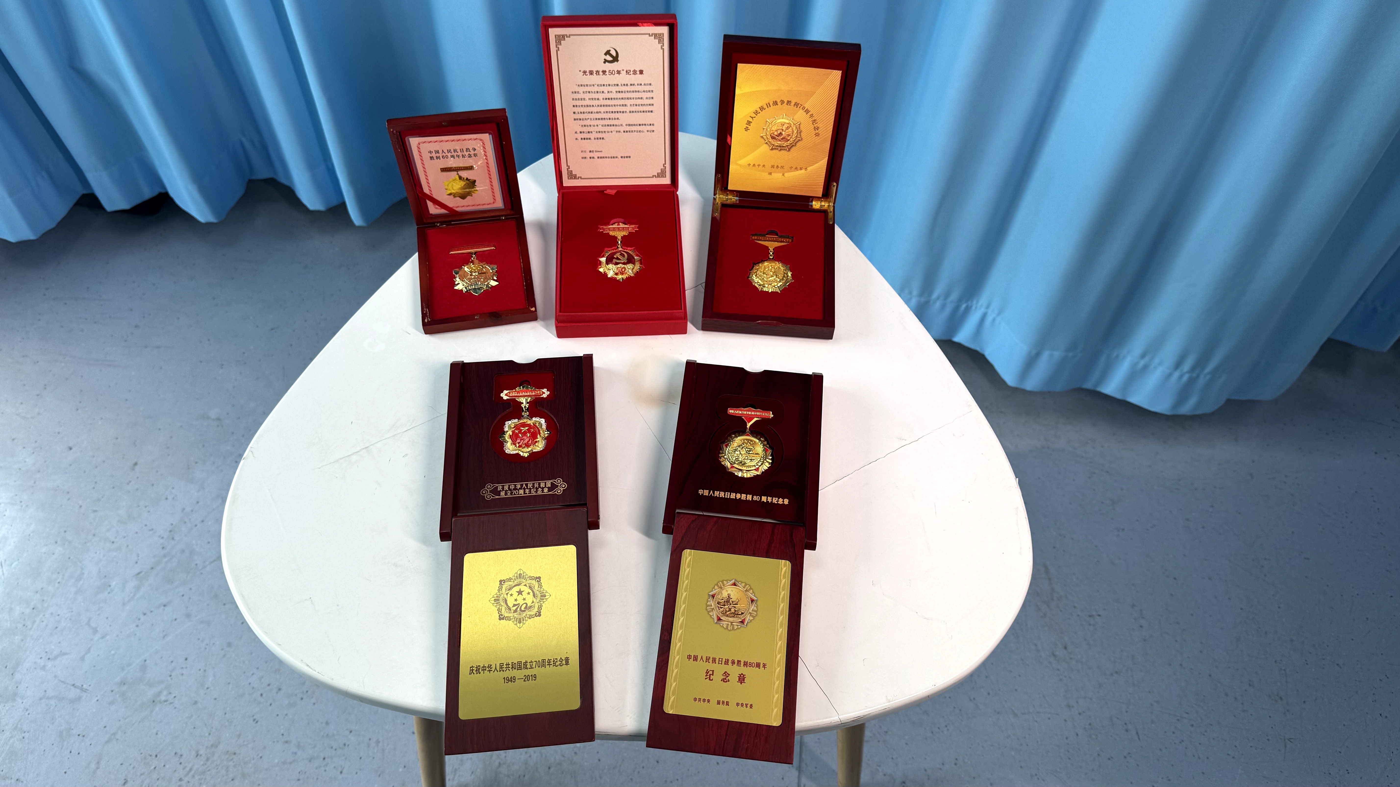 李君所获中国人民抗日战争胜利60周年纪念章、光荣在党50年纪念章、中国人民抗日战争胜利70周年纪念章 、庆祝中华人民共和国成立70周年纪念章、中国人民抗日战争胜利80周年纪念章。武汉市公安局供图