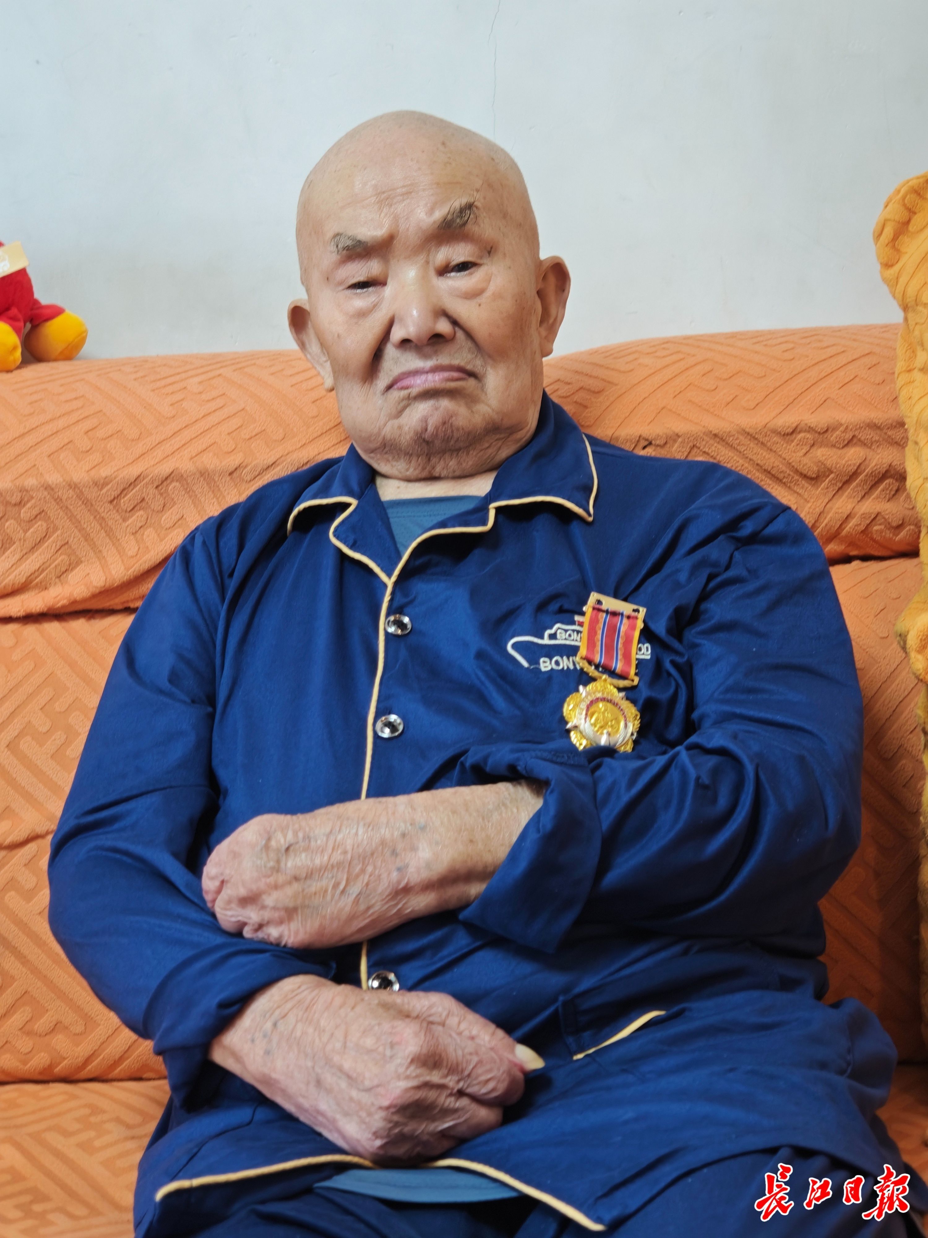 曾参加过抗美援朝的103岁老人李德普胸前佩戴着军功章。记者郝天娇 摄