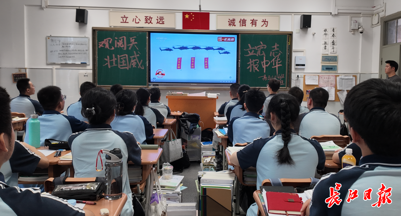 对青少年而言,九三阅兵是一堂跨越时空的历史课、爱国课与成长课。在十九中报告厅,收看阅兵式的高一年级学生神情专注,高二、高三年级各班学生身着整齐校服,在教室里通过电子屏收看现场直播。整齐划一的受阅方队、先进精良的武器装备、铿锵嘹亮的口号,让青春学子心中燃起浓浓爱国心、民族情。
