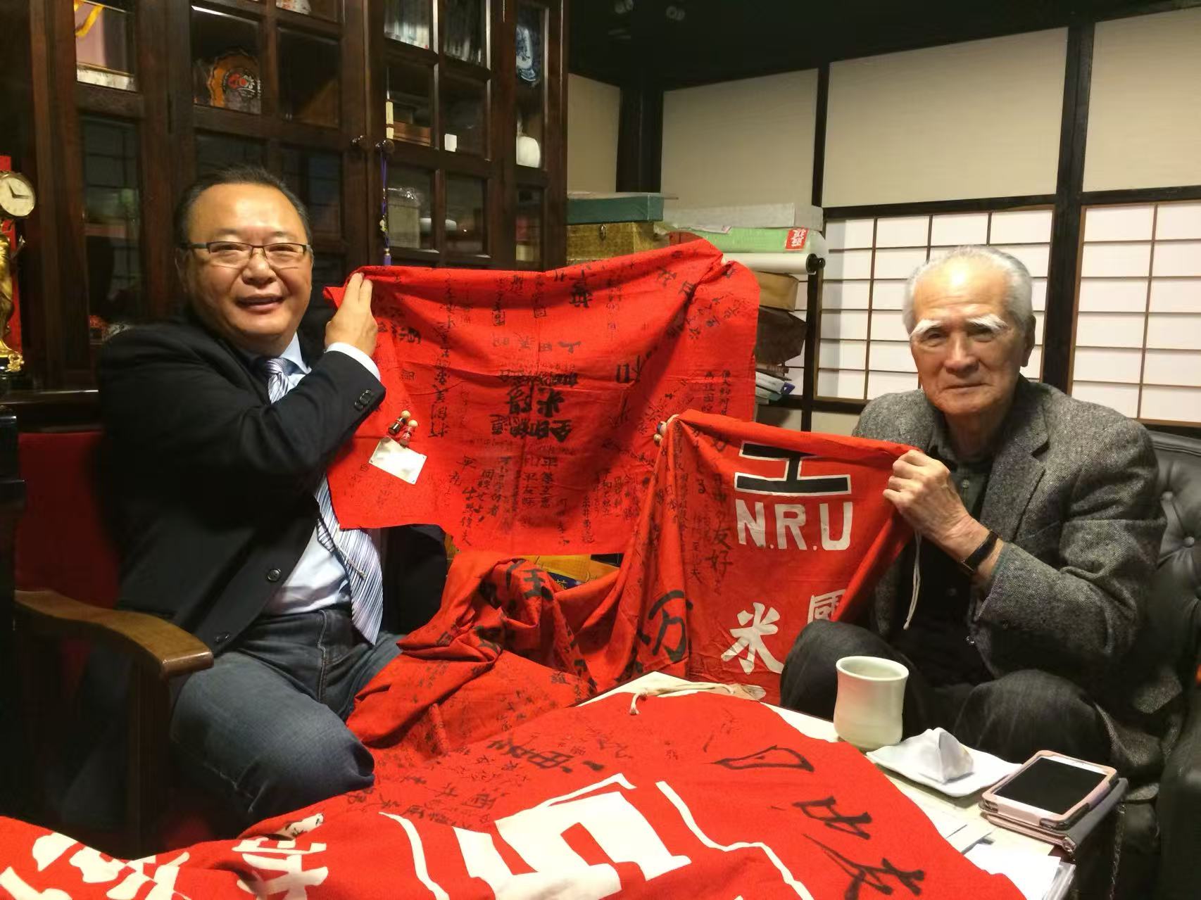 余熙在日本前首相村山富市(右)家中,向他介绍长江日报及“和平祈愿旌旗”。以上图片均由余熙提供。
