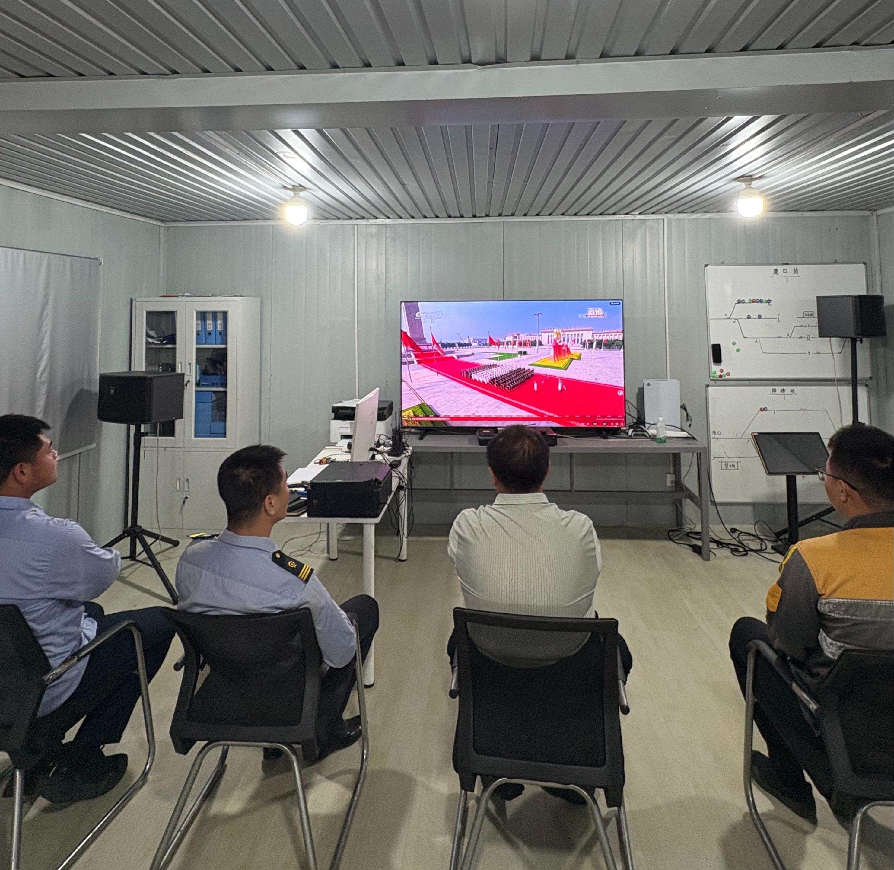 武汉锦华盛铁路机车有限公司邦矿铁路项目员工收看阅兵盛典。受访单位供图
