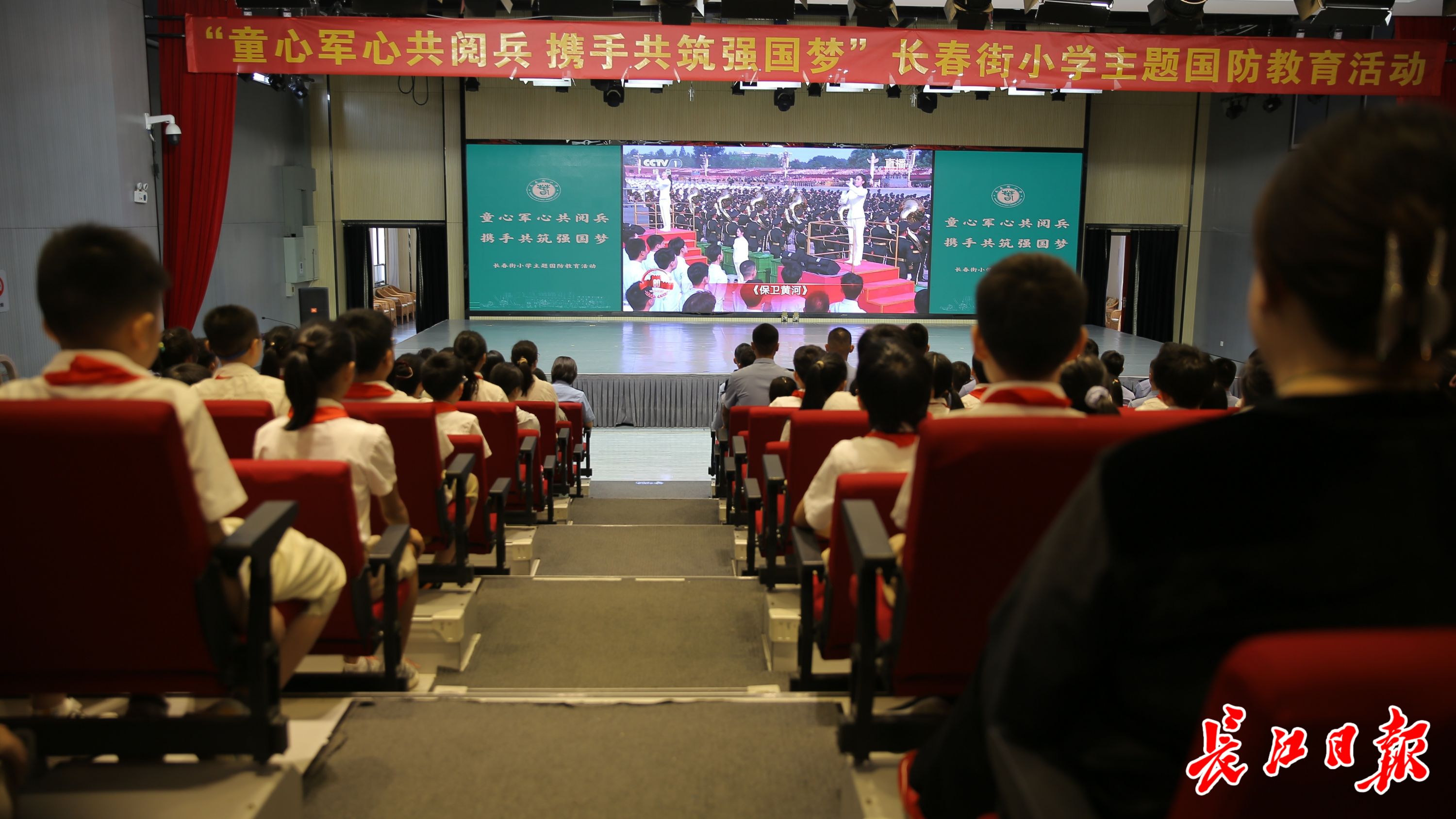 当日,长春街小学邀请空军预警学院的官兵与儿童剧团成员一起收看阅兵式,并开展“共观大阅兵,共话强国梦”国防教育活动。官兵们还跟小学生们分享了自己保卫边疆的故事。