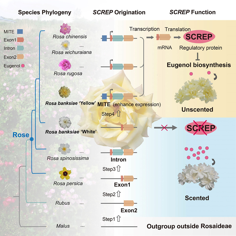 大约6300万年前,同为蔷薇亚科物种的树莓里骤然出现了一段无功能的“非编码DNA”,随着蔷薇属物种植物的千万年演化,这些零散基因片段逐步演变为可编码蛋白质的完整基因框架SCREP。而随着一个名为MITE的“跳跃基因”插入其启动区,如同安装了能量电池,促使SCREP增强表达,最终影响了蔷薇属植物花香。