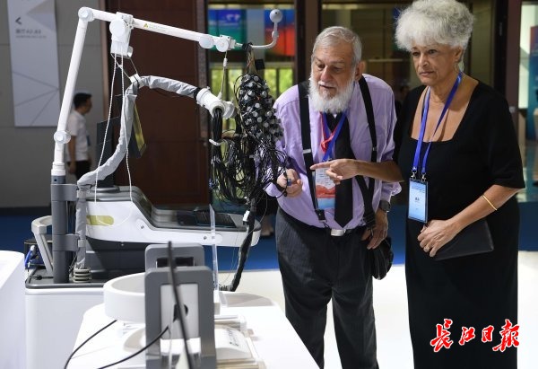 光谷生物城展区展示的光学脑机接口,近红外脑功能成像装置,吸引外宾的关注。 长江日报记者高勇摄