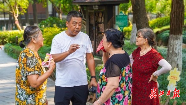 梅复传(左二)在汉阳公园巡园时与市民交流。记者李子云 摄