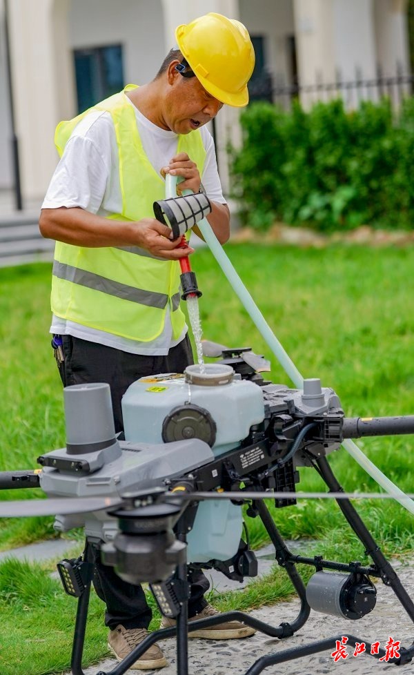 梅复传给植保无人机加水和叶面肥。记者李子云 摄