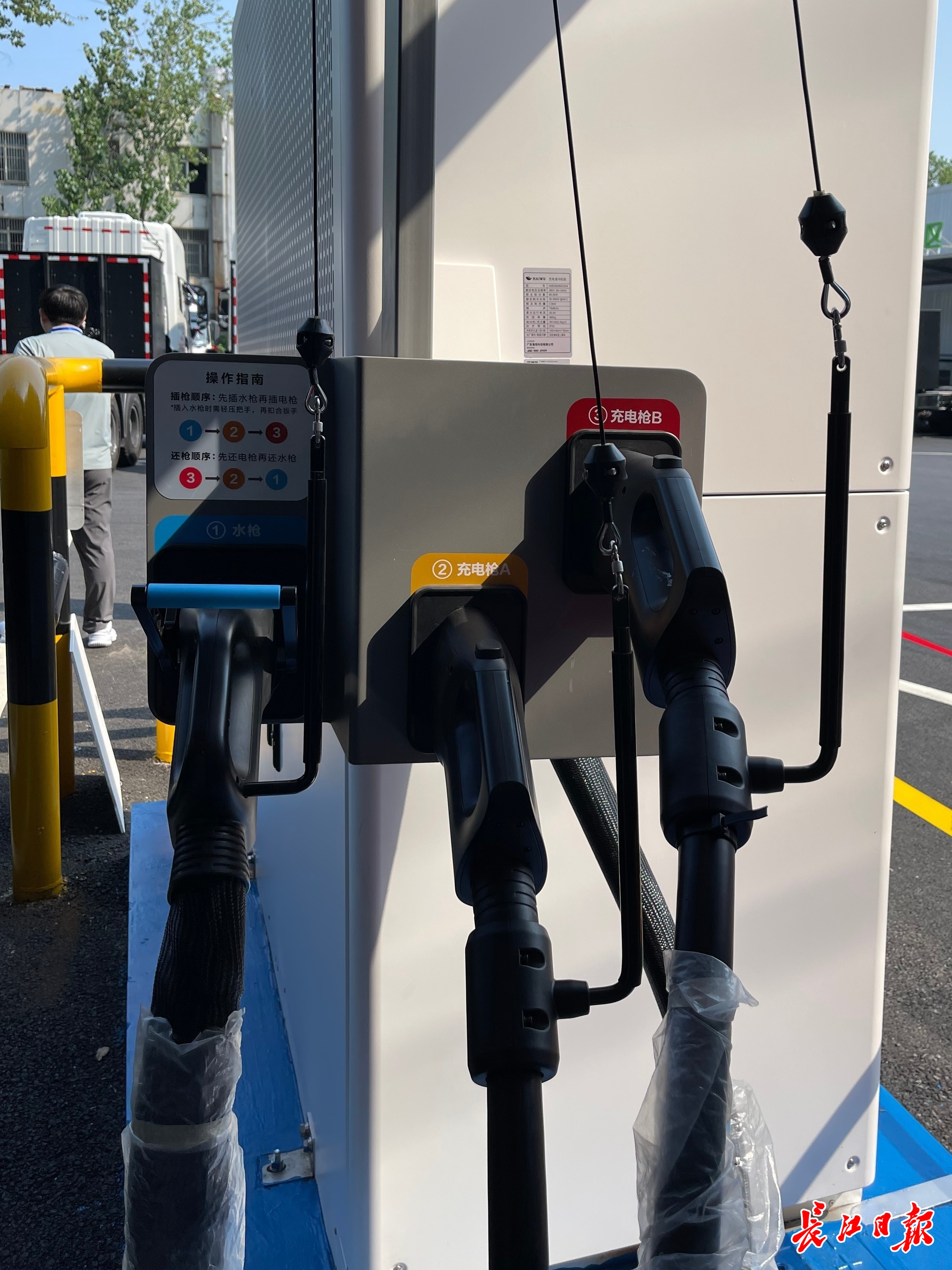 现场,湖北省首个电动重卡超充示范站亮相。该站已部署10个重卡车位,包括1个兆瓦车位与9个快速充电车位,据介绍可同时满足兆瓦重卡、普通重卡及轻卡的充电需求。