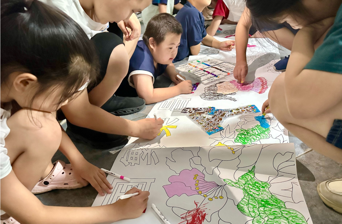 活动现场,40余组亲子家庭与特教老师共同创作“童心绘和平”画卷。