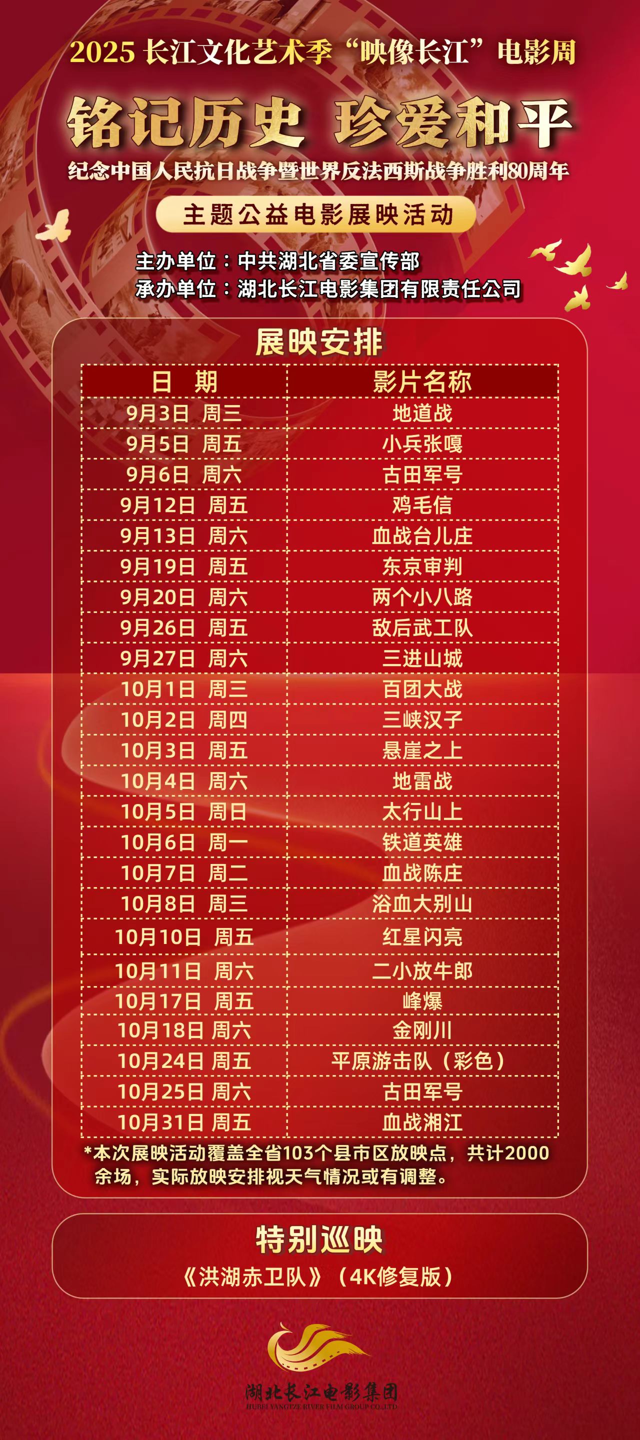 据悉,本次“铭记历史 珍爱和平”主题公益电影展映活动将在全省103个县、区的社区、广场、公园、学校等开展,在两个月内集中展映《平原游击队》《太行山上》《百团大战》等20部优秀抗战题材影片和经典红色电影《洪湖赤卫队》(4K修复版)。通过“流动放映+定点展映”,以光影为纽带,让爱国主义精神在荆楚大地广泛传递,以文化力量赋能湖北支点建设和长江经济带高质量发展。