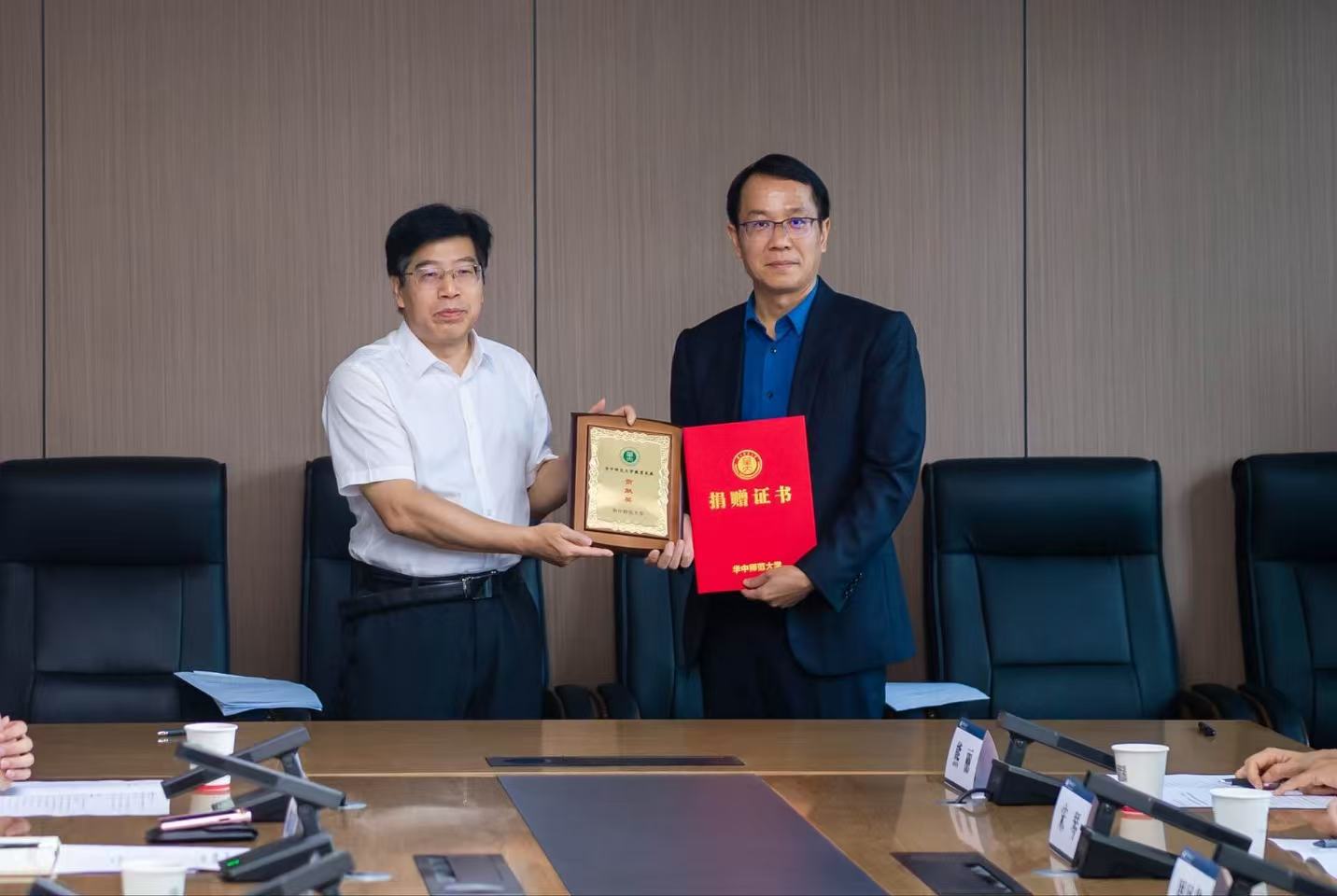 华中师范大学校长彭双阶(左)向华进公司董事长胡杰颁发捐赠证书。通讯员陈希昌摄