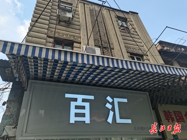 在大夹街与新安街的交会处的百汇服装店,是一栋外观古朴的建筑,墙体为浅灰色,建筑立面可见竖向线条设计,夹杂纹理装饰。记者得知,这里二楼是汉剧大师陈伯华故居。
