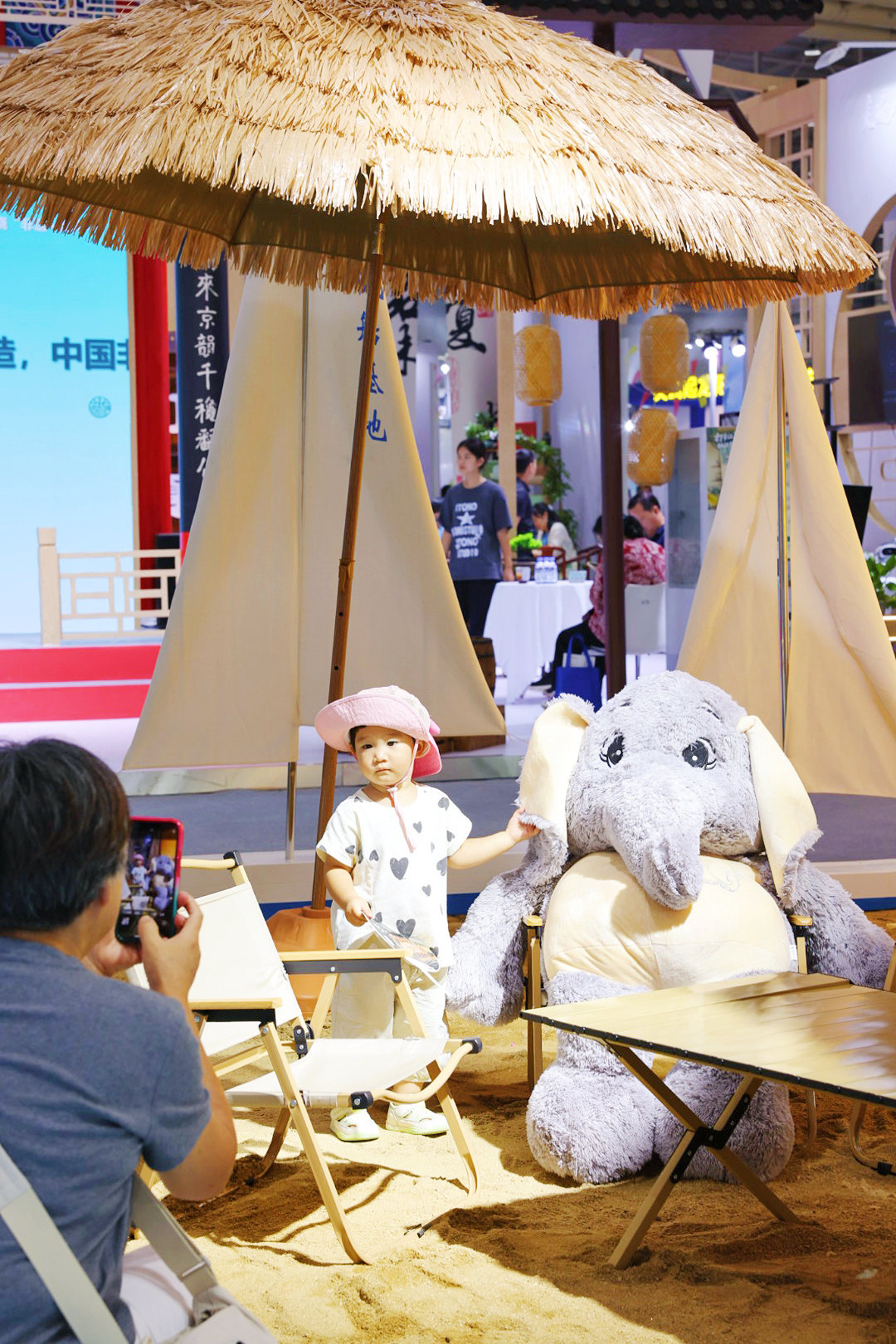 武汉东湖馆设置缩小版的东湖沙滩,真实的细沙铺地,搭配草棚和休闲座椅,还原了东湖沙滩浴场的闲适氛围。不少观众逛累了,就坐在躺椅上休息,仿佛置身湖边。展区另一侧,复刻版“东湖之眼”摩天轮、凌波门栈道等实景装置与大幕联动,构建沉浸式剧场循环播放东湖四时风光影片。观众可于栈桥之上,透过折幕大屏体验唯美日出,仿佛身临其境。