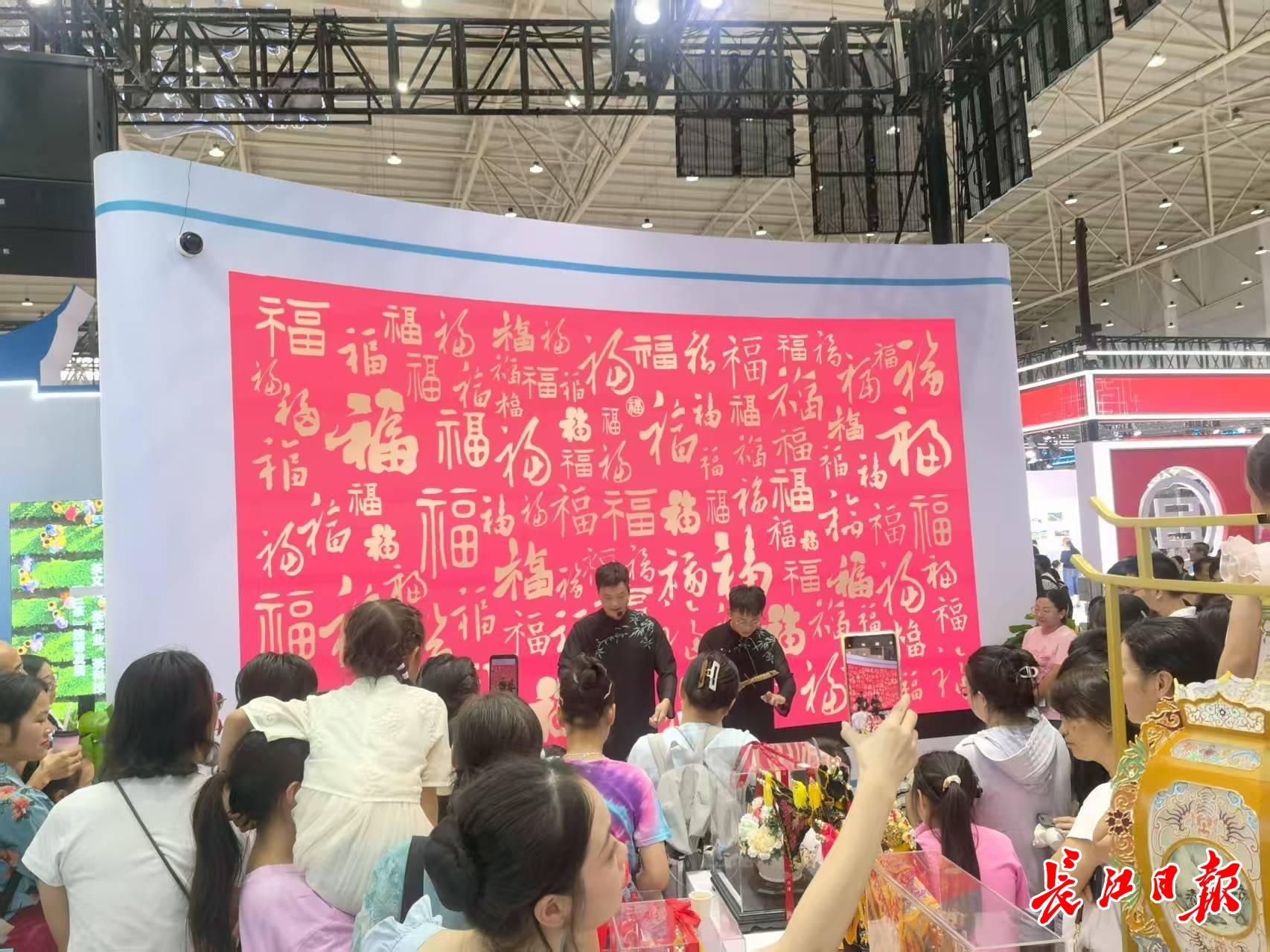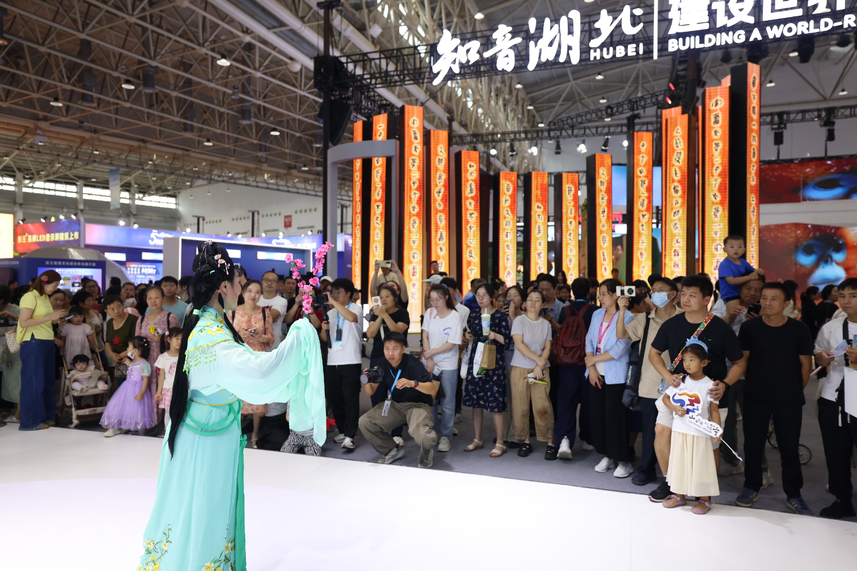 随州展区最吸睛的当数编钟乐舞——展区内陈列着一套曾侯乙编钟仿制件。当编钟清脆的乐声在馆内响起,搭配着古风舞蹈中水袖的翩跹翻飞,整个展馆瞬间被市民与展商围得满满当当。演出落幕,大家纷纷上前试敲和触碰青铜编钟,在“一钟双音”的独特震颤里,触摸随州作为“中国编钟之乡”的厚重历史脉搏。