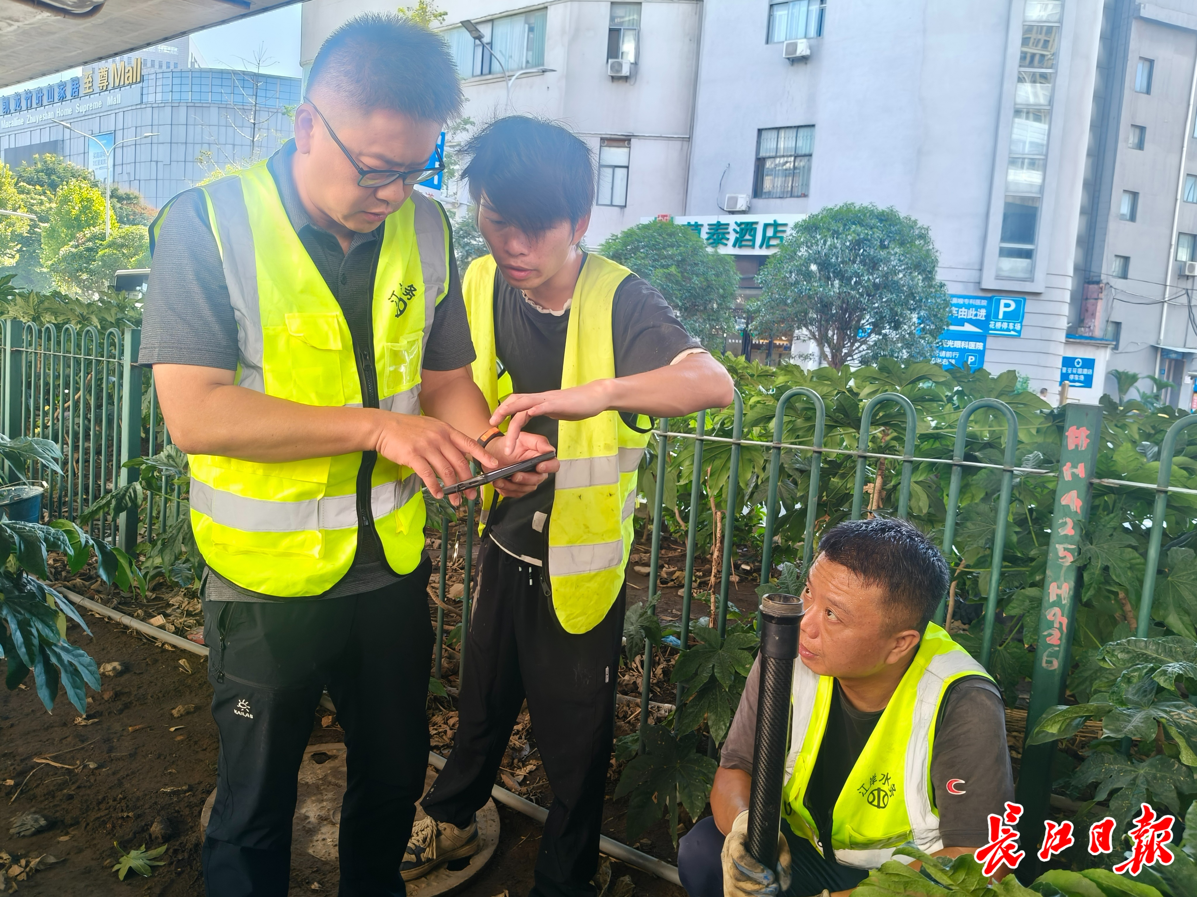 郭志(左一)在发展大道排查管网故障点。记者刘海锋 摄