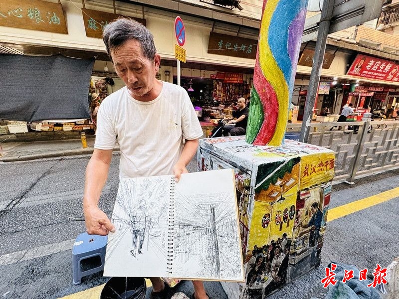 9月16日下午5时许,夕阳余晖将荣华街道集贤三路染成金黄色,退休美术教师易小阳手执画笔,一边观察路边一家水果摊,一边将店主收起遮阳棚的动作画下来。半年来,易小阳在硚口区荣华街道绘制120余处“小巷烟火”,用画笔记录百姓的幸福生活和城市更新。