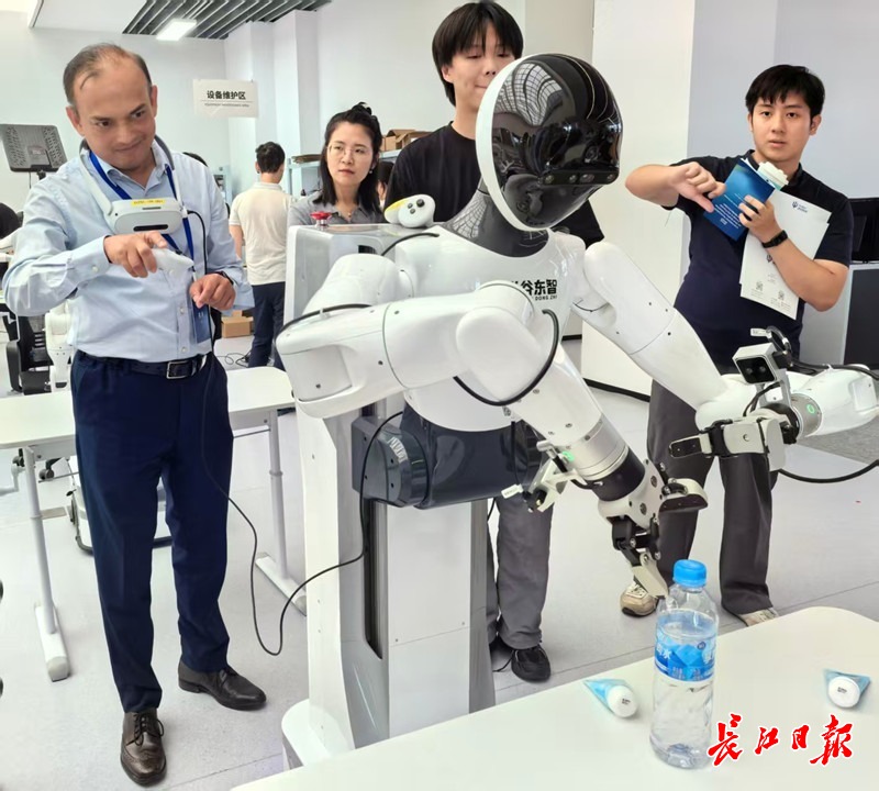 在湖北人形机器人创新中心,孟加拉国驻华大使馆公使兼副馆长习奥·哈桑体验操作手柄,指挥人形机器人练习抓取矿泉水瓶。 记者范婷婷 摄