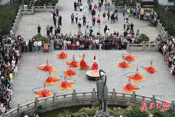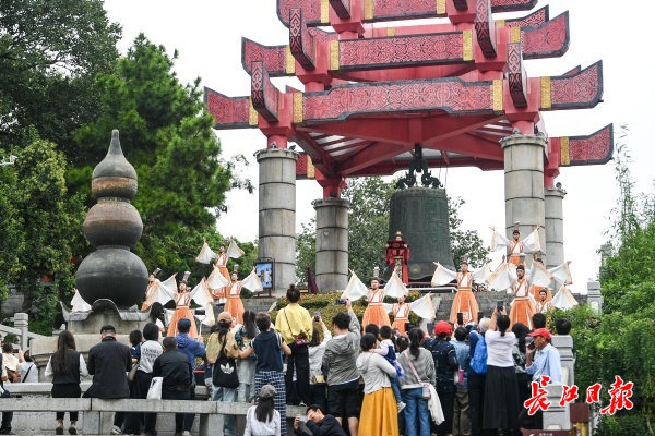 黄鹤楼东侧山脊高台上悬挂着一口千禧钟,是专为迎接千禧年而造的,与武汉关的钟隔江对望。在千禧钟前上演的《鸣钟祈福礼》,是黄鹤楼送给游客的另一场文化盛宴。身着楚制深衣的演员们踏地转身,红色衣袂如楚凤展翅;编钟古乐与祈福祝词交织,将荆楚礼乐的庄严典雅展现得淋漓尽致。来自安徽的老夫妇久久伫立:“这场演出很庄严,让人震撼,让我们感受到荆楚大地的历史文脉。”