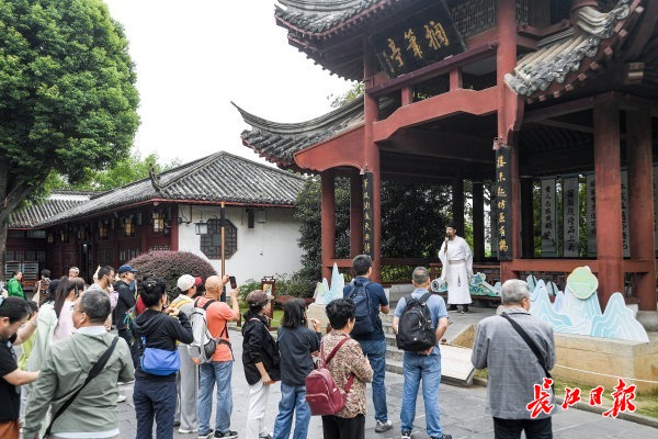 “没想到黄鹤楼这么好玩,不仅仅是登楼看景!”来自江西的三年级学生轩轩刚和“诗仙李白”对完三首诗,脸上还带着兴奋。在景区内,每到一处,都能遇见惊喜——搁笔亭内《梦回太白》、千禧钟前《鸣钟祈福礼》、主楼内听《黄鹤楼中吹玉笛》……黄鹤楼正以鲜活的沉浸式体验,让每一位游客重新认识这座千古名楼。9月20日上午,“知音湖北・超级文旅日”主播带游客打卡武汉新体验第二站,聚焦城市地标黄鹤楼,带大家沉浸式感受“黄鹤雅集 闻笛探江”的浪漫。