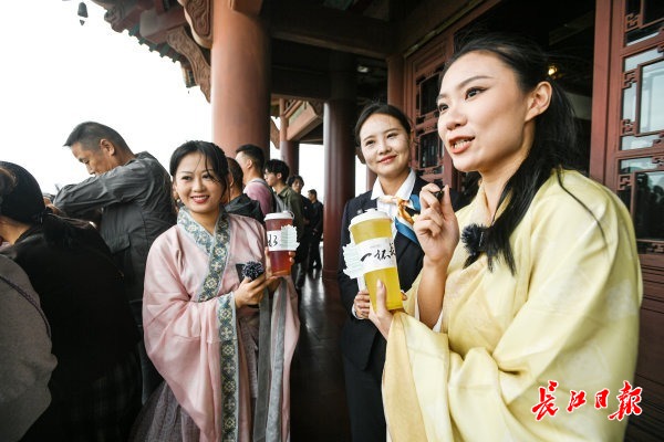 在黄鹤楼主楼5楼,一个小水吧吸引了游客驻足。来自上海的游客王先生说,“看到长江水这个名称,就觉得十分应景,特意买了一杯品尝。”持特饮“一杯长江水”在手,远眺长江、大桥、龟山同框,让全国游客感受到“共饮一江水”的浪漫。