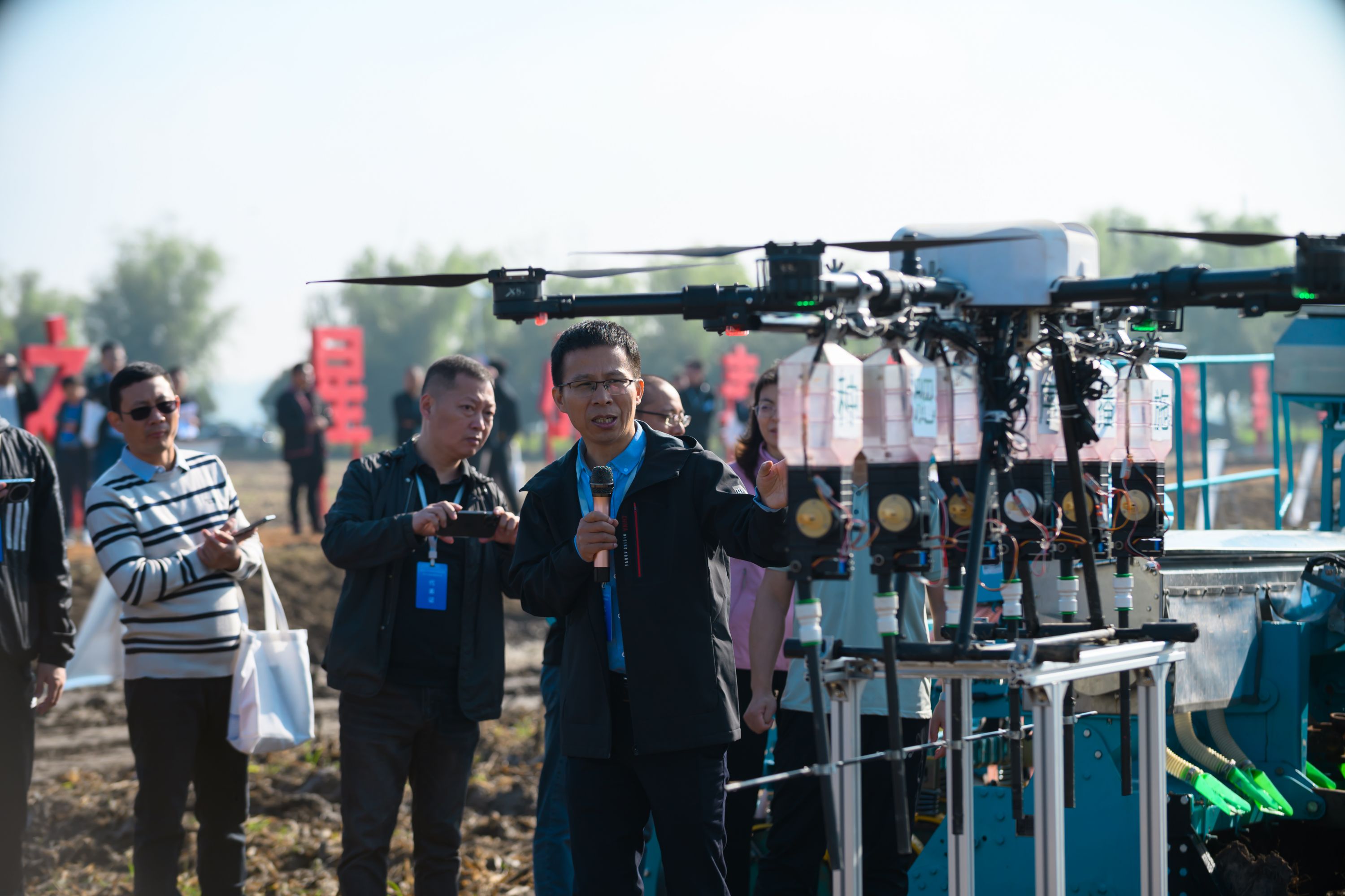 华中农大专家介绍无人机播种设备。顾泽洋 摄