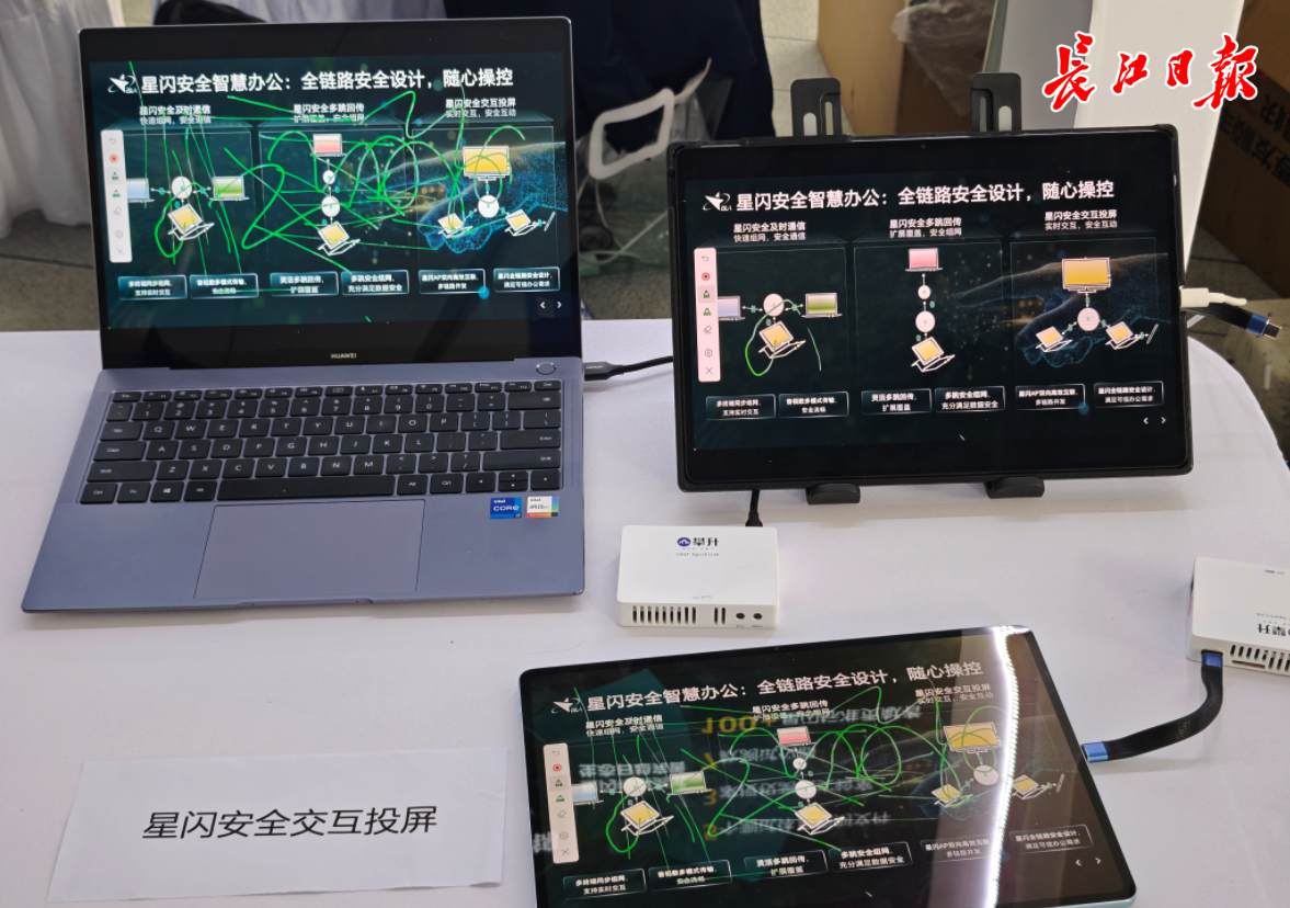 在国际星闪无线短距通信联盟的展台前,武汉攀升鼎承科技有限公司的工作人员正在向参观者介绍星闪投屏装置。“去年我们推出了第一版,现在已经更新为第二版,即将投入市场。”他将这个U盘大小的白色圆形装置插入平板电脑,手指在屏幕上轻轻滑动,绿色线条随指尖出现在屏幕上,也同步出现在眼前的桌上显示屏、笔记本电脑、挂式显示屏里。据了解,这款投屏装置可实现星闪安全交互投屏,替代了Wi-Fi和蓝牙技术。