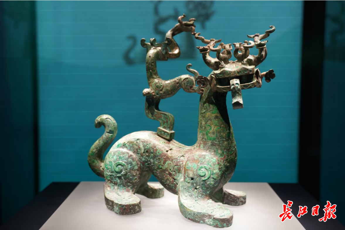 河南省文物考古研究院副院长杨文胜说:“这件神兽是一对中的一件,另一件藏于河南博物院,两件细节纹饰和动态有差异。”青铜神兽周身嵌绿松石,融合多种动物元素,因无法归类为已知动物得名“神兽”。这类复合型神兽形象,是长江流域青铜文化的重要特征。与中原青铜器重礼制不同,长江青铜器更重神祇想象与艺术表达,如著名的曾侯乙编钟,不仅规模宏大,纹饰也极具韵律感与想象力,青铜神兽便体现了楚人的浪漫情怀与长江文明的多元开放性。