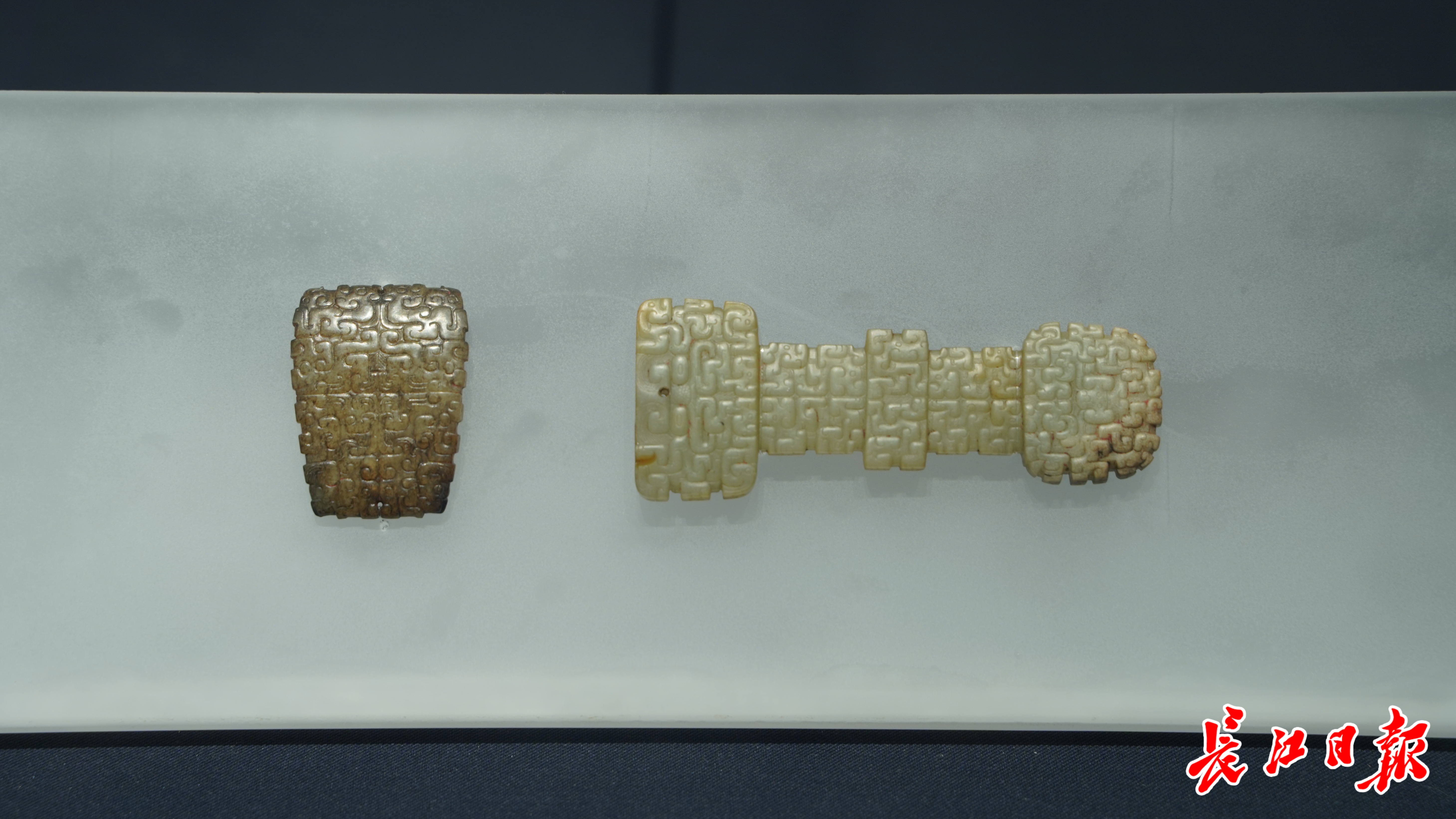 春秋龙纹玉牌饰(左),春秋龙纹玉剑柄(右),南阳文物保护研究院藏。 记者樊友寒 摄