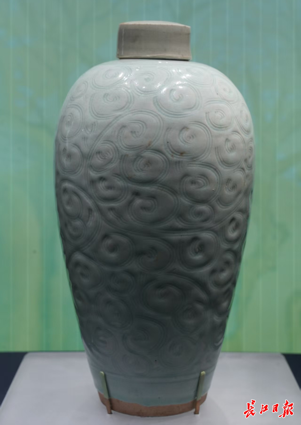 宋代景德镇窑青白釉刻划卷草纹带盖梅瓶,遂宁市博物馆藏。 记者樊友寒 摄