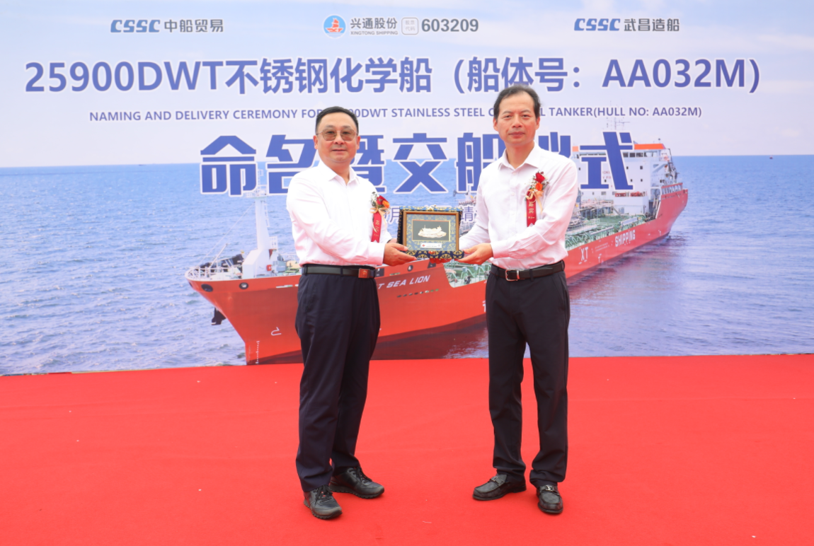 长江日报大武汉客户端9月26日讯(记者汪文汉 通讯员周建仁)9月26日,中船集团武昌造船为兴通海运股份有限公司建造的25900载重吨不锈钢化学品船“兴通海狮”在江苏靖江交付。该船的成功交付标志着我国高端化学品船设计建造水平达到新高度。