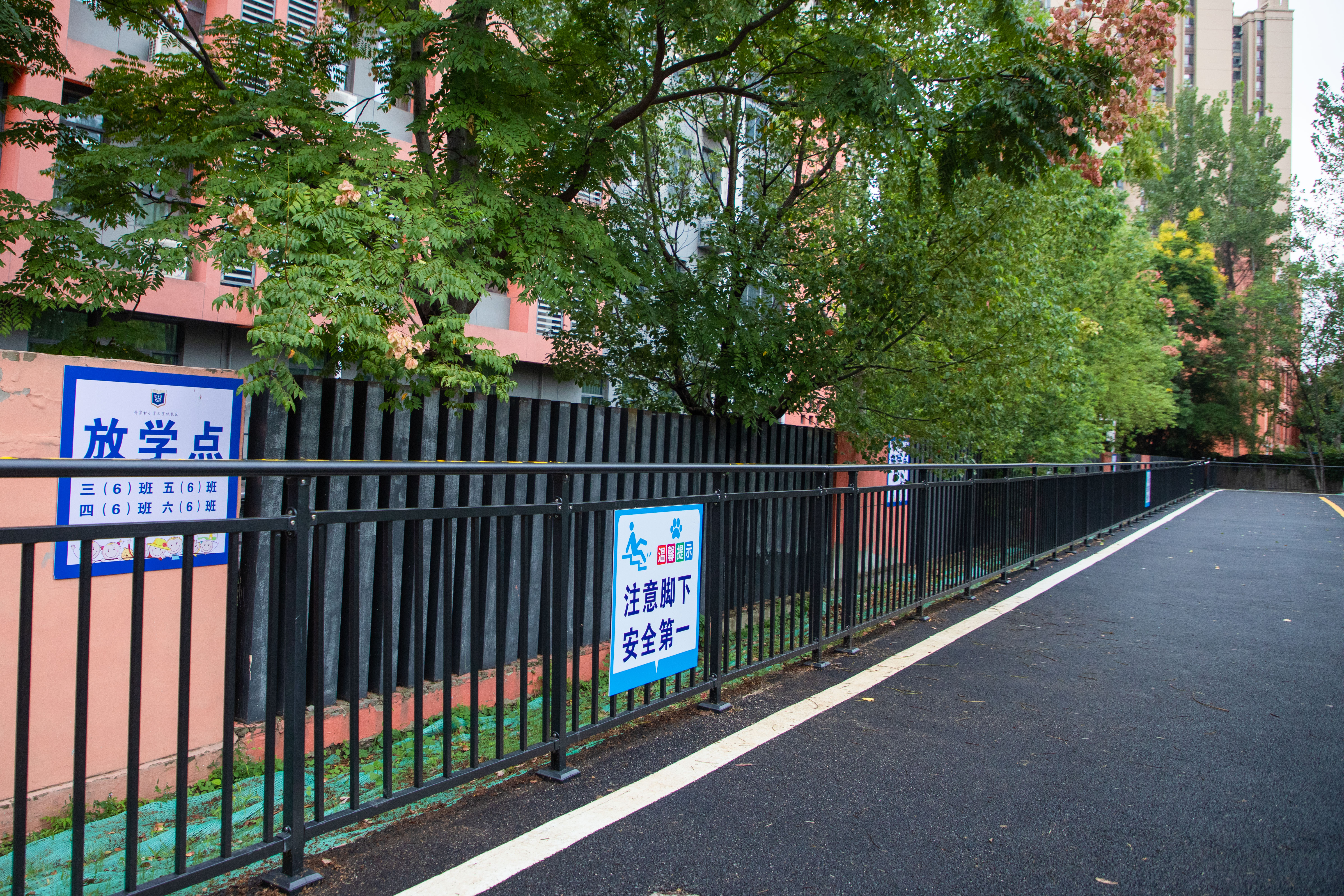 记者现场看到,这条放学通道位于学校东南角,开拓了一条宽3至6米、长110米的步道连通学校出入口,划定清晰的学生专用等候区。通道两侧设置了隔离设施,加装安全标语提示牌,同时在步道中部设置有长椅供家长休憩等候,实现了人流与车流的物理隔离。
