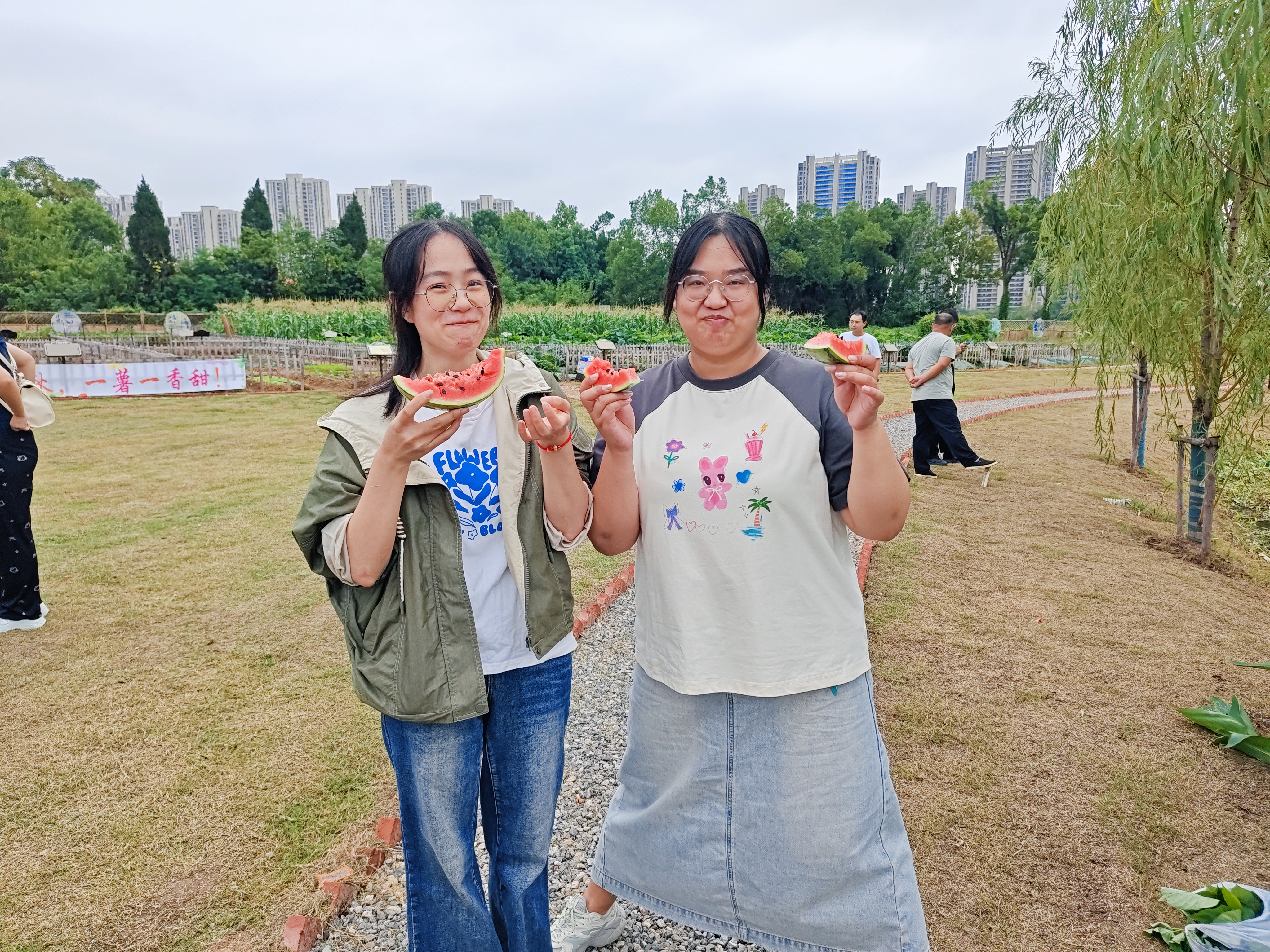 位于武汉经开区武监高速旁边的共享田园,市民正在吃自己种植的西瓜。通讯员供图