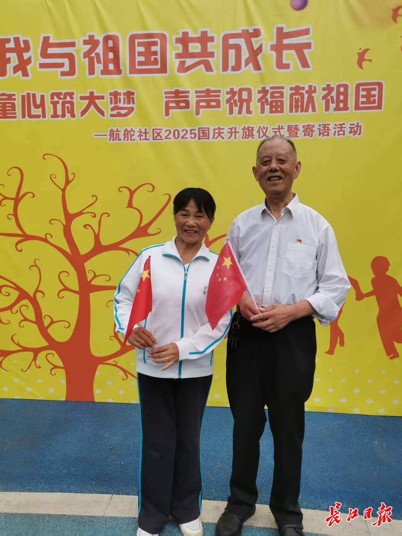 10月1日9时,航舵社区工作人员、部分社区党员和武东小学的部分学生及其家长来到社区广场,共同参加升旗仪式。叶盛桂佩戴党员徽章、手执国旗,看着鲜艳的五星红旗随着音乐声缓缓升到旗杆顶,他的眼眶湿润了。