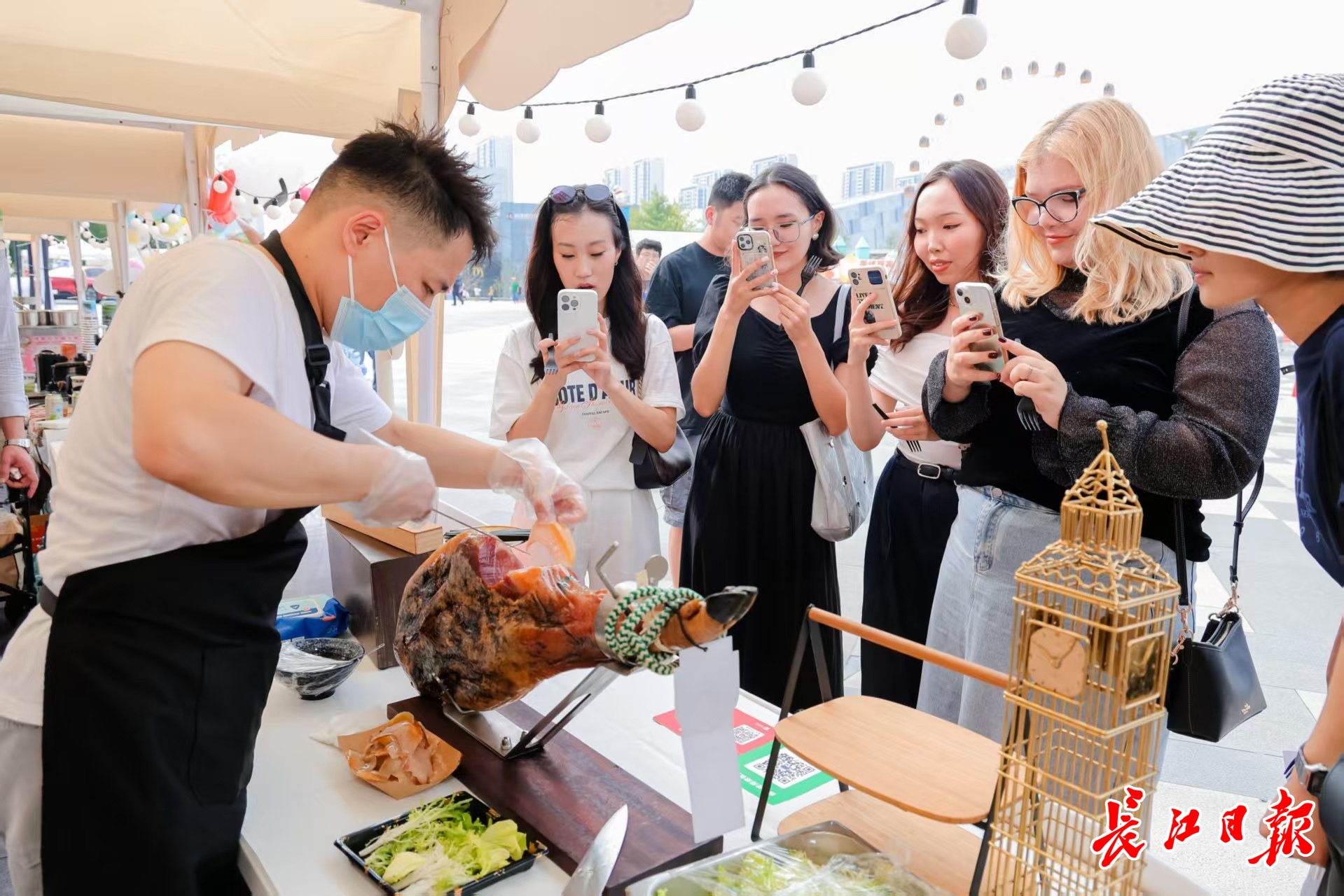 在广场四周,美食市集也拉开帷幕,40余家全国人气品牌及黄陂本土特色摊位纷纷亮出他们的“拿手菜”。黎黄陂路传奇牛排店带来厚切肉眼牛排;武汉本土精酿品牌“水豚酿造”携手“糖豆咖啡”,提供手工精酿与现磨意式咖啡。泰式奶茶、手打柠檬茶、爆蛋吐司、辣炒年糕等亚洲街头小吃,让游客大饱口福。值得一提的是,来自杭州的原创毛绒品牌“雨过山”首次来到武汉,以其治愈系设计成为打卡热点。