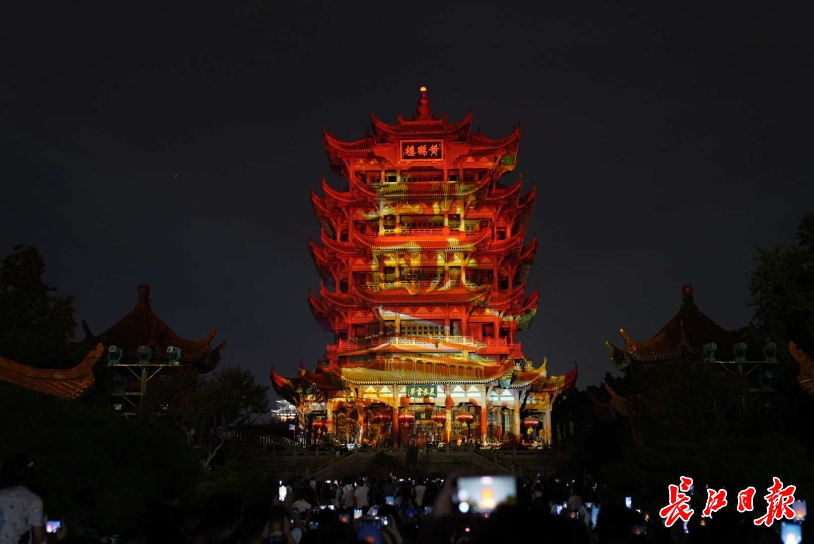 “夜上黄鹤楼”主楼光影秀勾勒出“喜迎国庆”等字样。