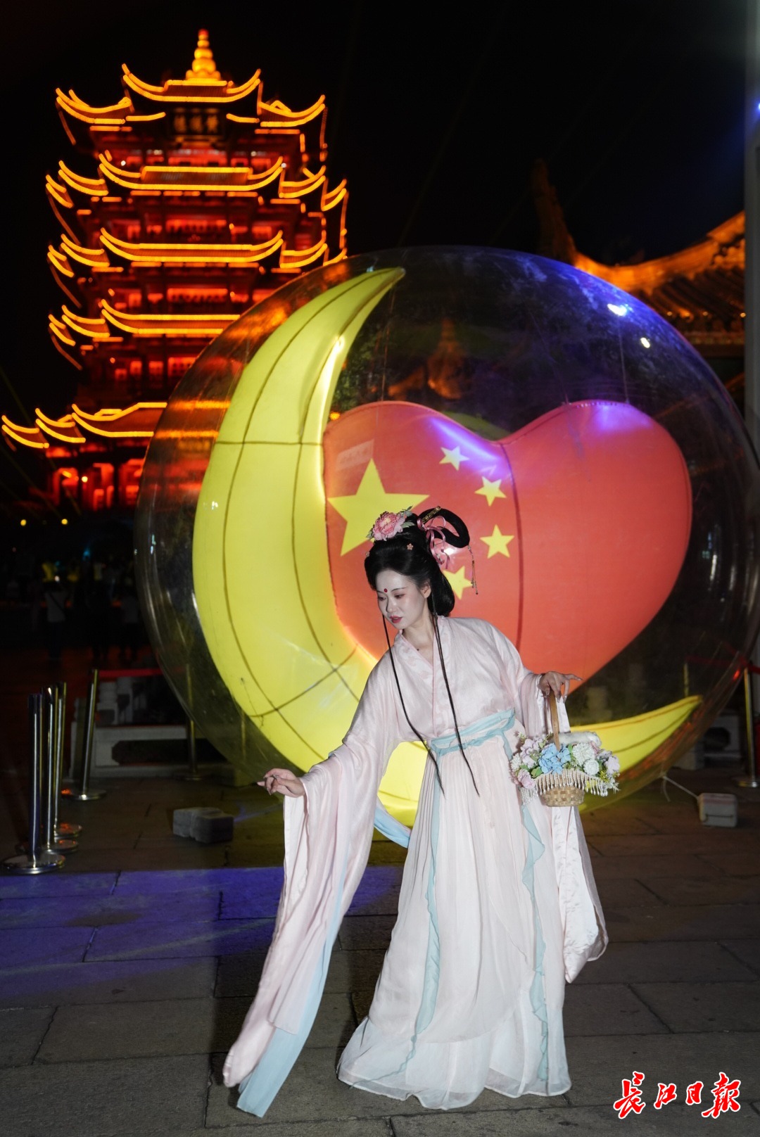 黄鹤楼前,巨型的“爱心月亮”格外夺目。