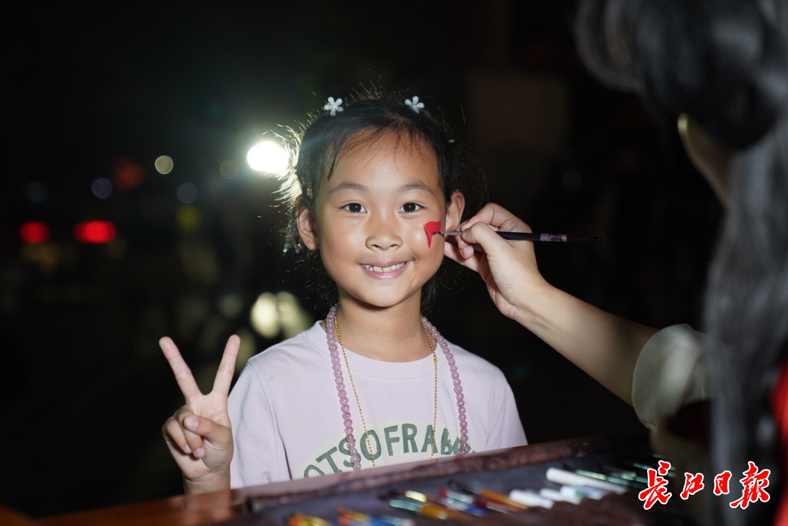 在园区西广场上,一轮巨型的“爱心月亮”格外夺目,引得游人纷纷驻足。而在千禧钟处的“我在黄鹤楼庆双节”主题墙前,孩子们手举国旗拍照打卡,笑靥如花。最引人注目的,莫过于“名将巡游”环节——只见“岳飞”一身戎装,英姿飒爽,带领游客习武练拳。他招式刚劲、气势如虹,每一式都透出中华武术的深厚底蕴,引来阵阵喝彩。此外,在国庆主题点妆活动区,游客排队描绘五星红旗、中国心等图案。