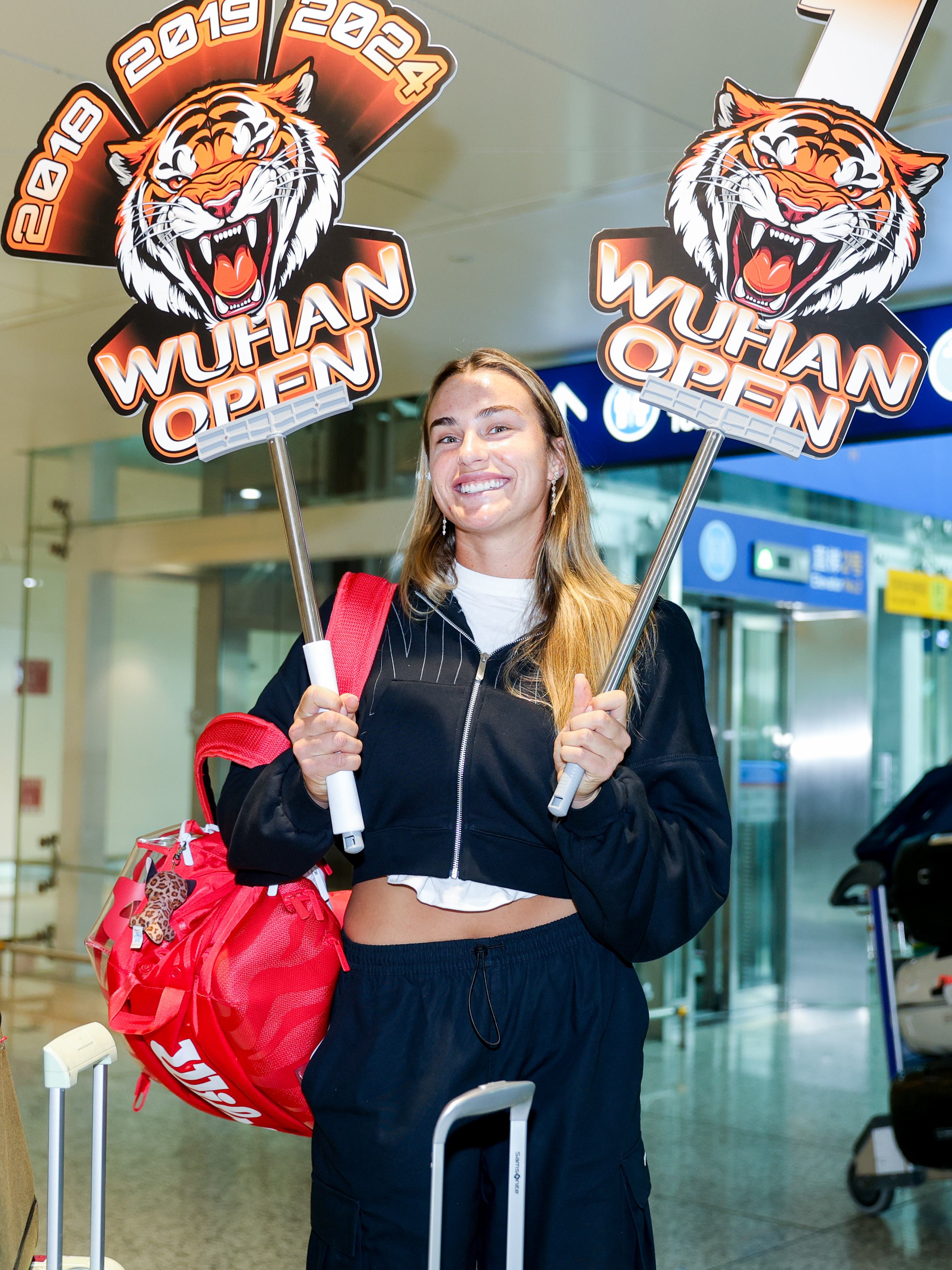 为了迎接“虎妞”再回武汉,组委会也是煞费苦心,围绕“虎”这个主题做足文章。萨巴伦卡一出机场,就收到了两个印有虎头图案的标志牌。一个是数字“1”和虎头的组合,另一个除了虎头外,注明了她夺冠的“2018”“2019”“2024”三个年份。这个别出心裁的设计令萨巴伦卡眼前一亮,她开心地接过自己的专属标志牌留影。