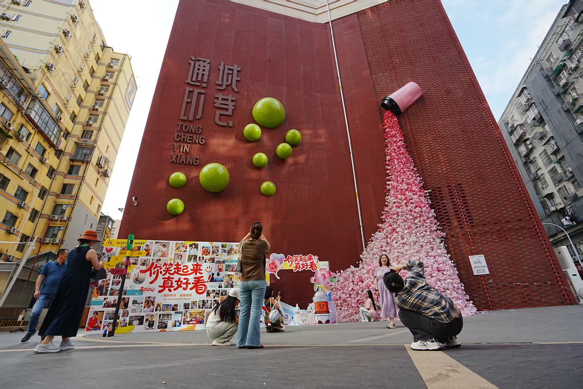 游客在老通城·通城印巷艺术墙前打卡。 通讯员供图