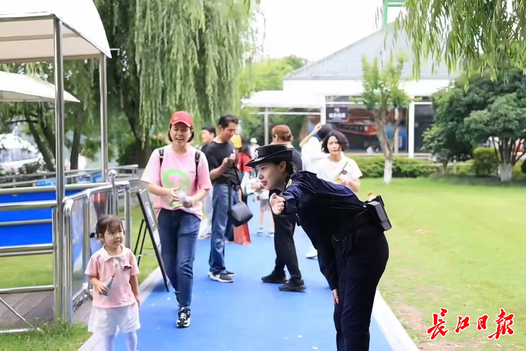 东湖绿道巾帼服务队队员正在为游客指引游玩路线。 通讯员供图