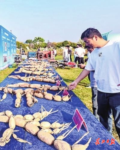 一根刚刚采挖出水的紫红色外皮藕带,吸引了著名作物遗传育种专家傅廷栋院士的目光,他拿起这根藕带端详许久,“这意味着藕带的花青素含量高,抗氧化效果好。蔡甸莲藕可以继续加强品质改良、品质育种,让消费者吃饱、吃好、吃健康”。