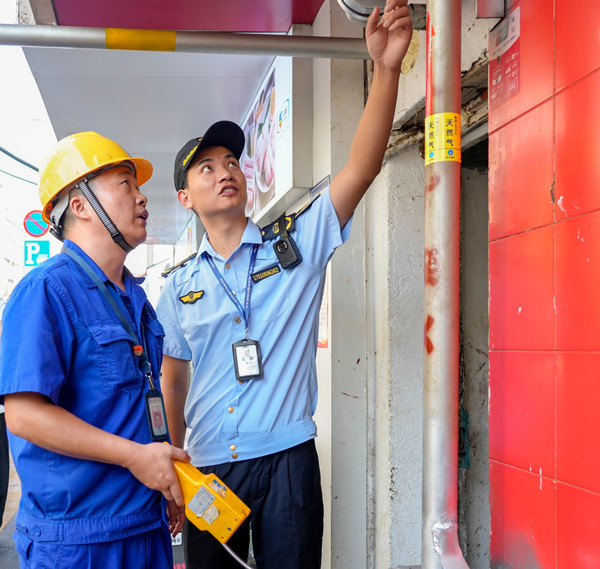 黄鹤楼街道综合执法人员(右)和天然气公司工作人员讨论管道设施的安装。