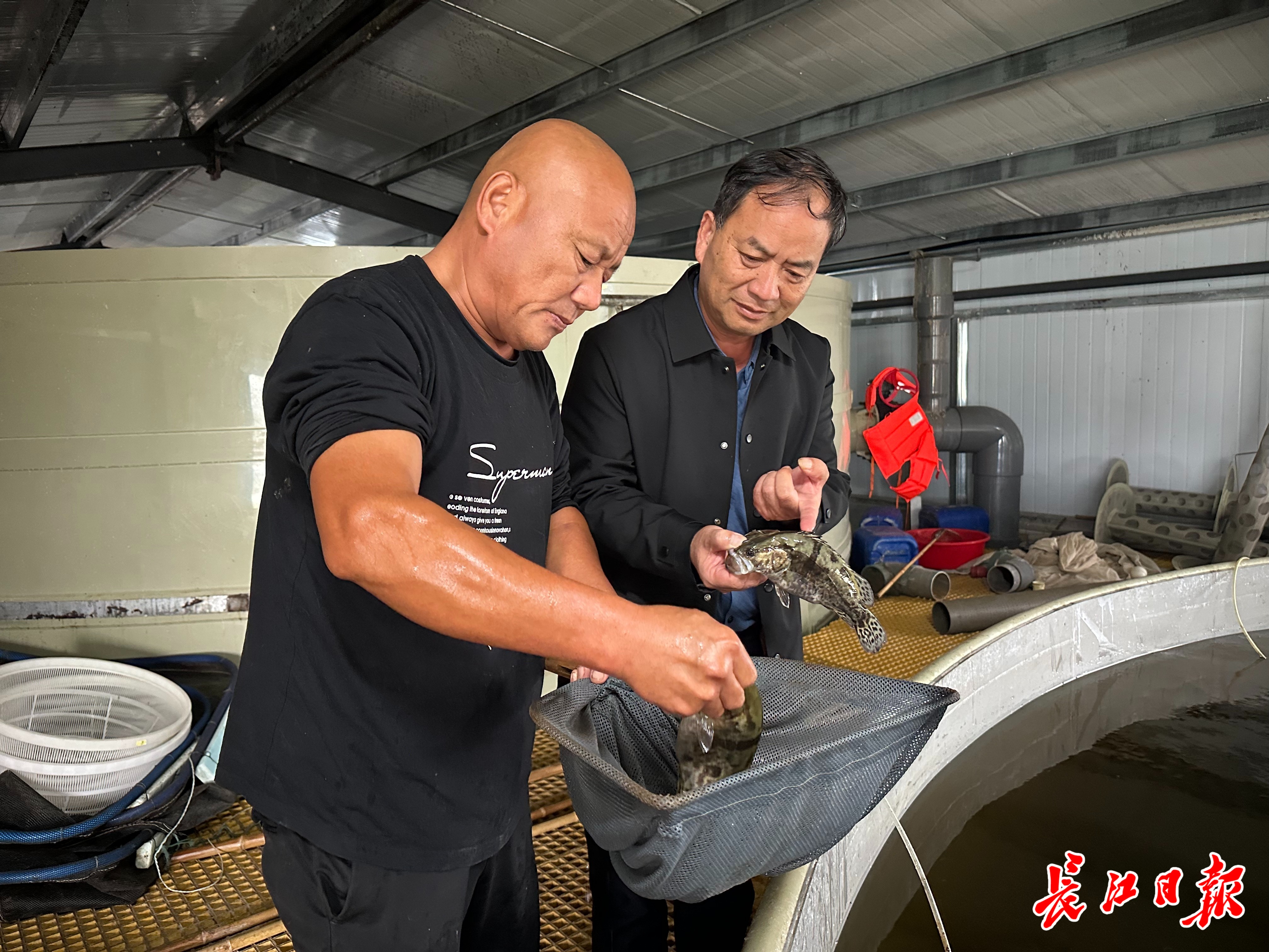 徐德忠与养殖户尹成川交流鳜鱼养殖。记者张衡 摄