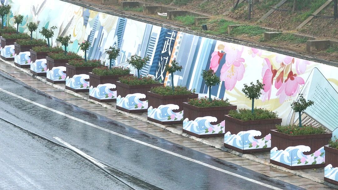 龚家岭收费站旁鲜花盛开,江汉关等武汉地标融入立面装饰。