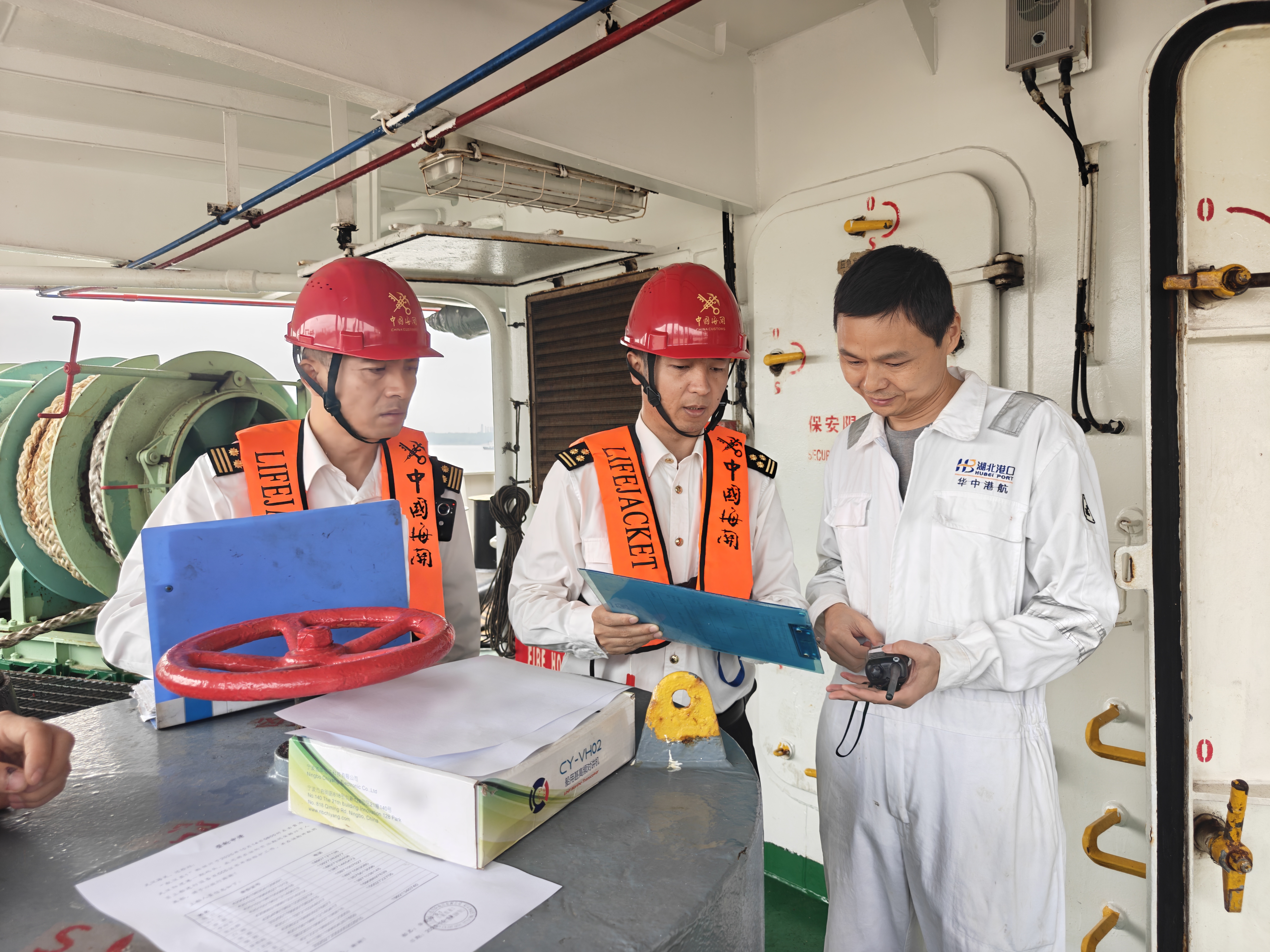 武汉新港海关关员对直航船舶“华航汉亚1号”开展登临检查。图为通讯员提供。